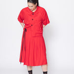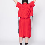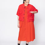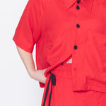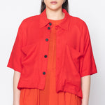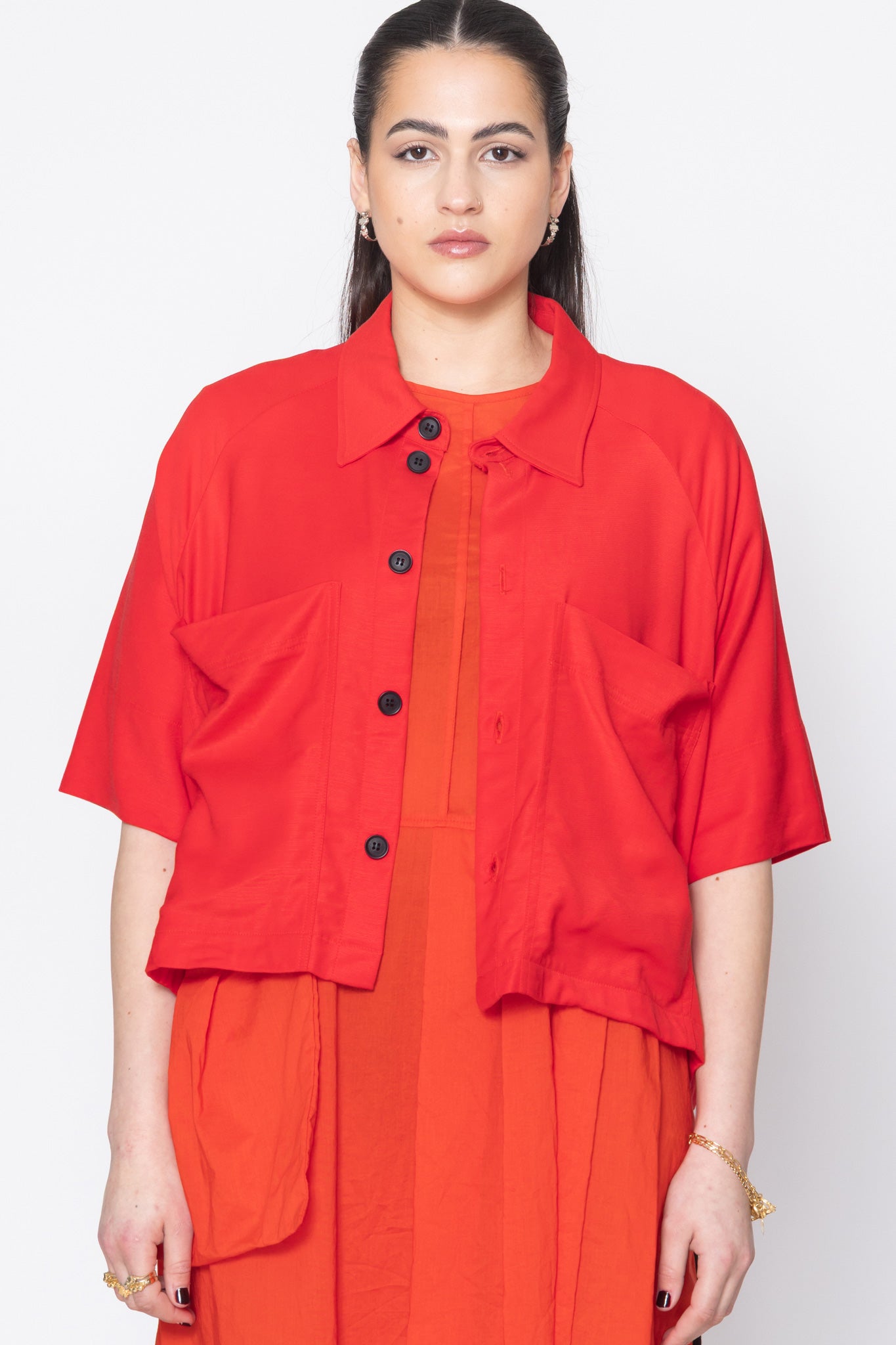 Short sleeve shirt in a super soft viscose suiting, designed for a relaxed to oversized fit. Raglan sleeve waist length shirt with generous fit collar, front patch pockets with pleat detail and front button up closure. Back has casing with tie to cinch in to adjust fit, this is a great crop style to wear as a shirt or jacket. Worn with the Hysteric Dress and the Reality Skirt.