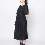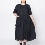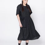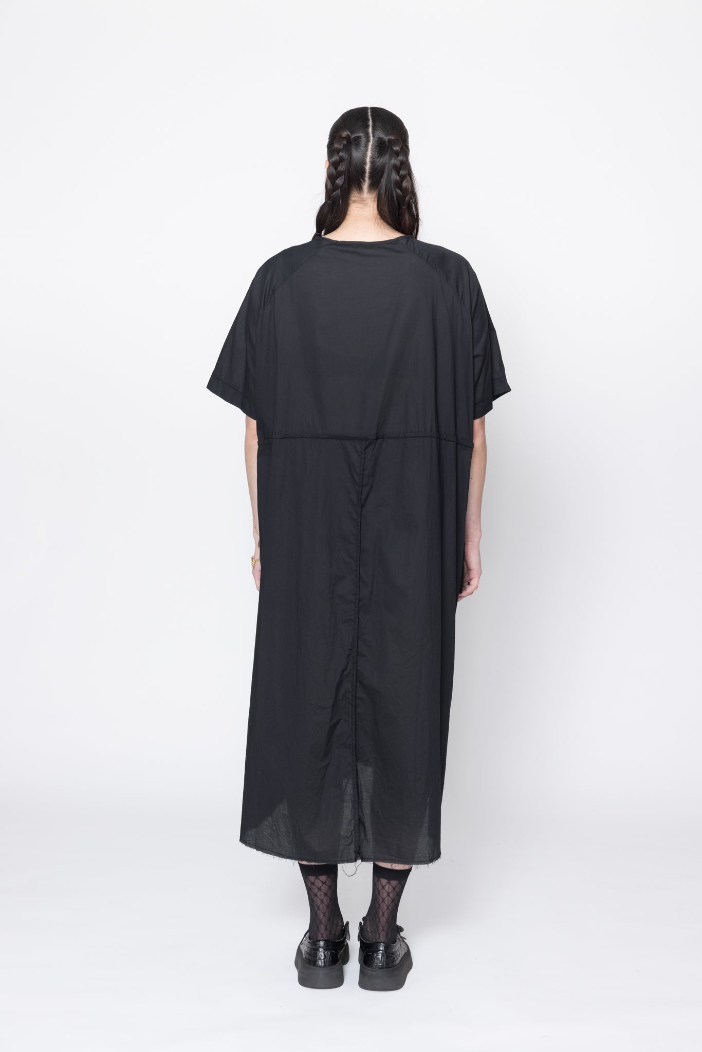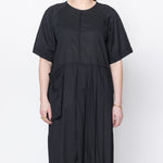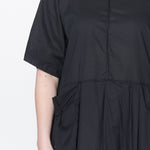 Short sleeve dress in a crispy cotton shirting, designed for an oversized fit. Front features round bound neck, wide pleating on one side and a large pleat pocket on the other, roomy raglan sleeves and french seam details. This dress is pre-styled ready to go, worn on its own.