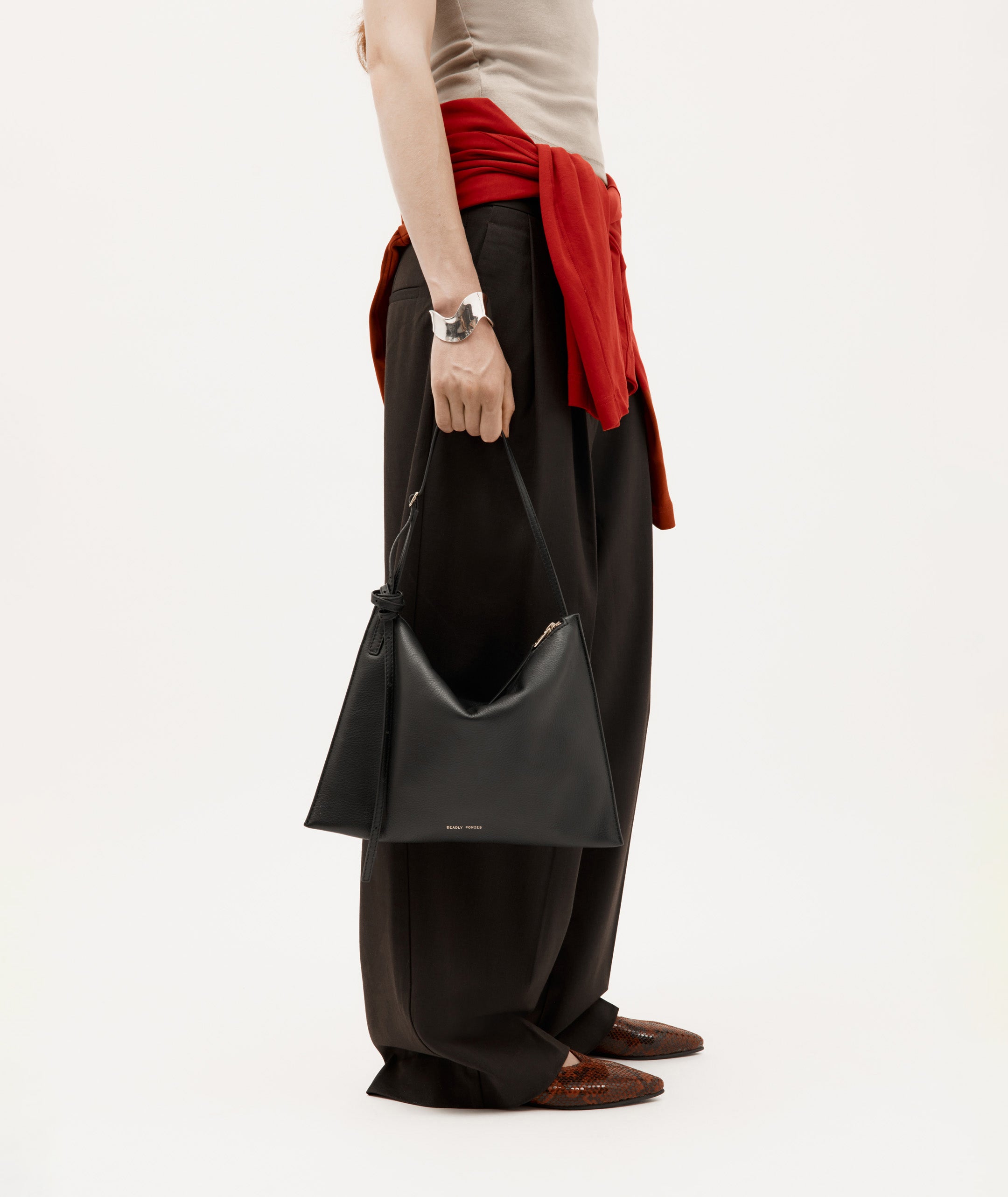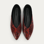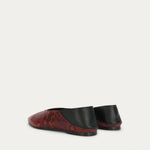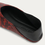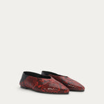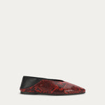 Epona Flat in Magma is crafted from textured Python-embossed Capra Leather, with a contrast Lamb Nappa back and lining, LWG-certified. Featuring a signature pointed toe, tapered heel, and padded fixed insole. Designed for versatility, the back can be folded down to transform the style into a slip-on.