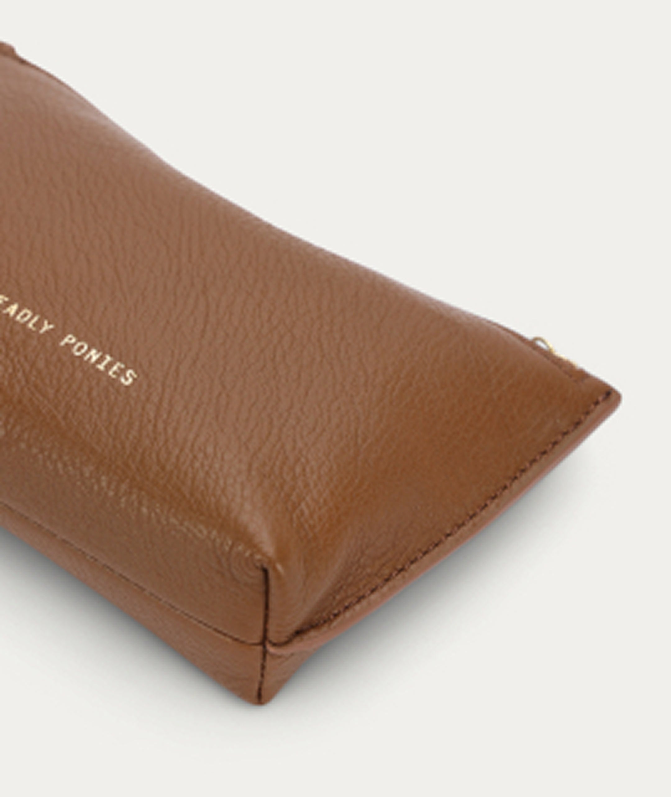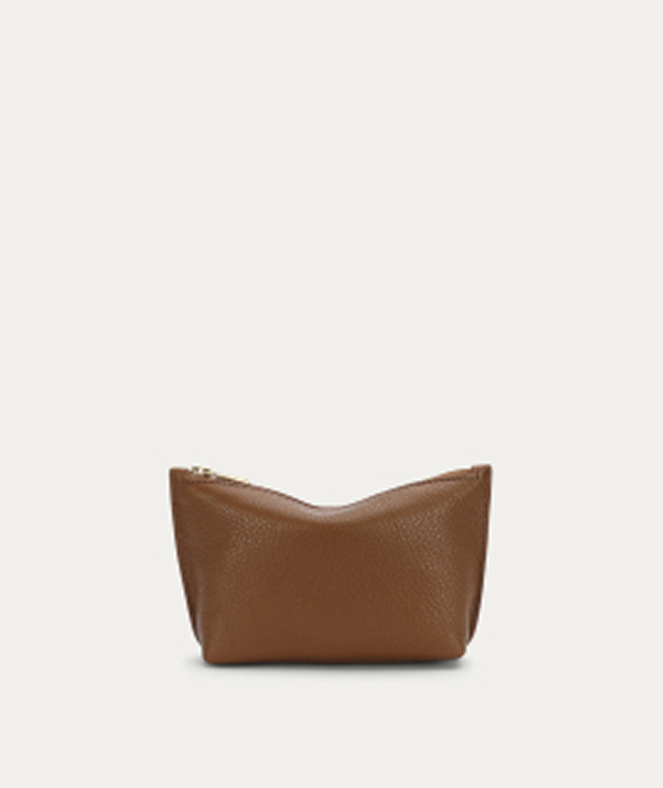 Poucher in Toffee is crafted from supple Calf Nappa with Calf Suede interior, and features a zip closure with solid brass hardware.
