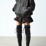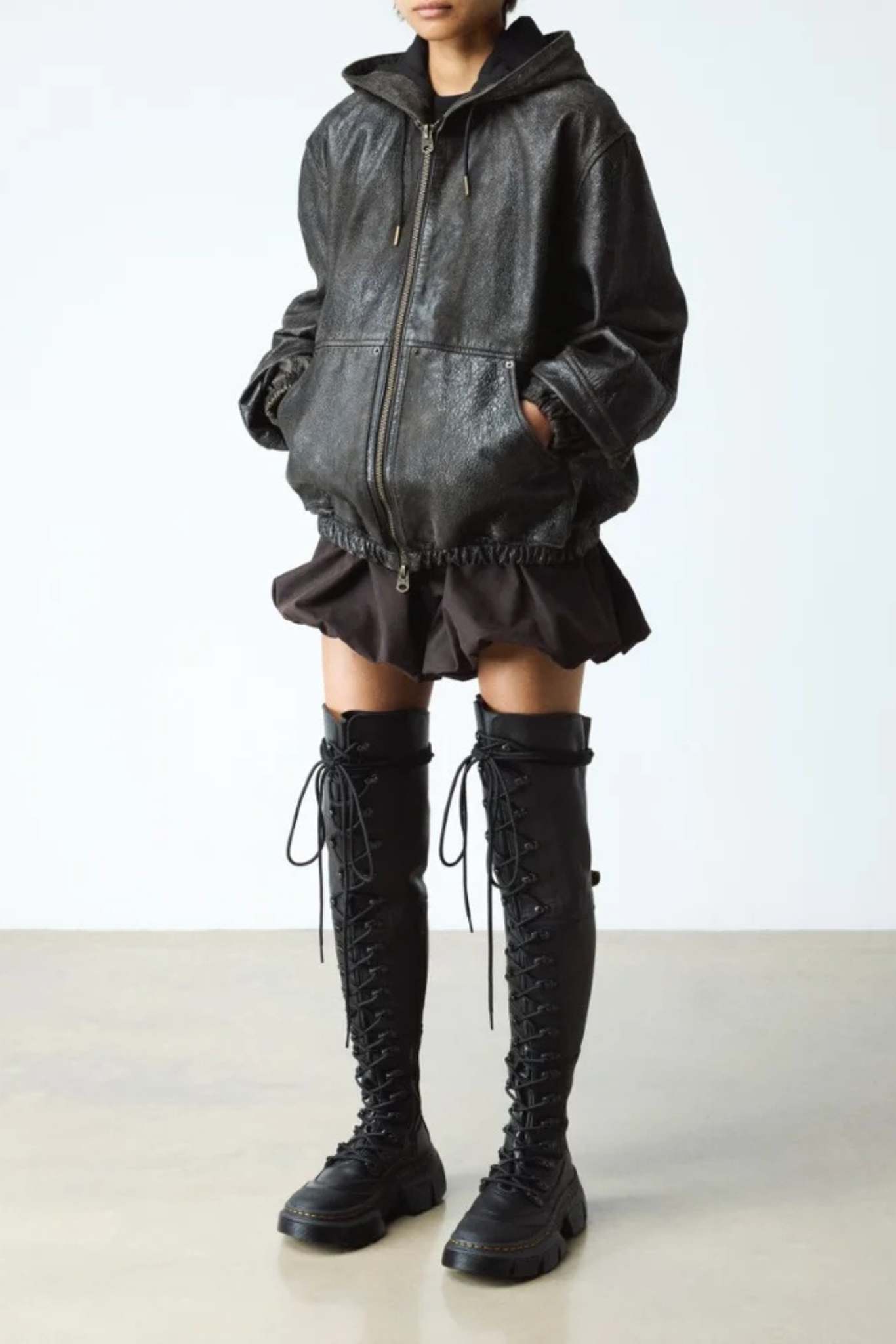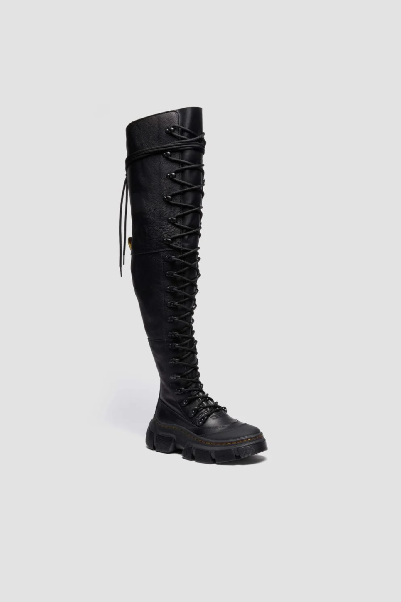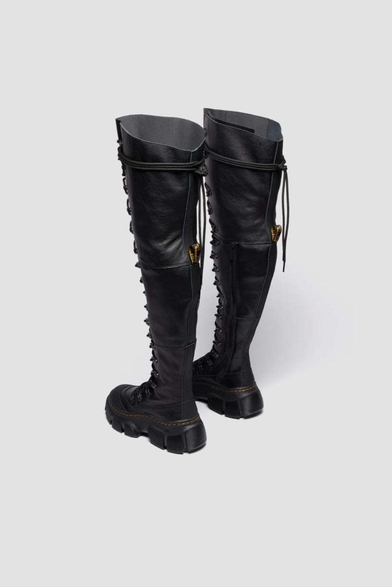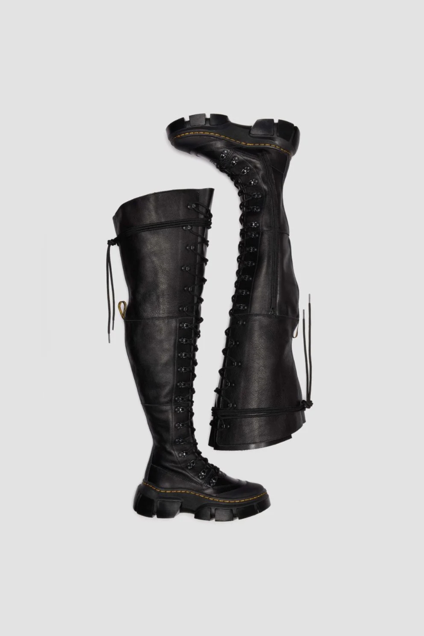 DMXL’s biggest, boldest form. A towering 19-eye over-knee boot set on the exaggerated, lightweight DMXL sole. Cut from soft, pliable Virginia leather that delivers comfort and resilience in equal measure, combined with Stretch PU for additional flexibility. Highlighted with a rubberized leather toe cap. For ease of wear and access, the boot is fitted with inner zips. Each pair is finished with extra-long wraparound laces, an AirWair heel loop and unmissable yellow stitch along the DMXL sole.