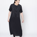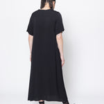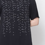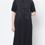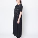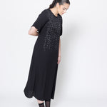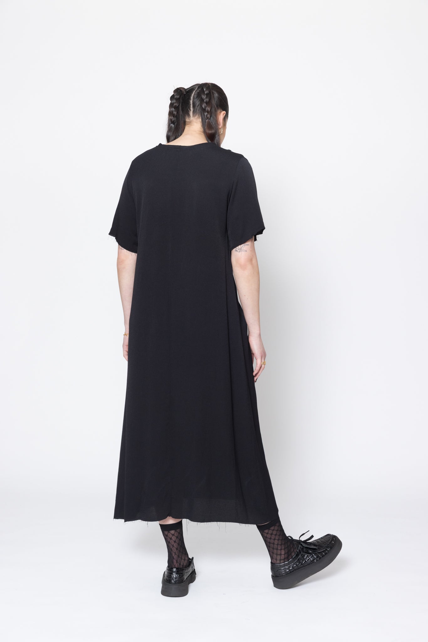 Short sleeve dress in viscose twill, designed for a relaxed fit. Individually hand printed with our signature Scatter print in concrete grey. This print is designed in house, the artwork is reflected song lyrics by Screamin' Jay intended to be revealed in a mirror. Featuring a round neck with classic neckband and raw hems. This is a great throw on trans-seasonal dress, worn on its own.