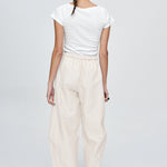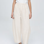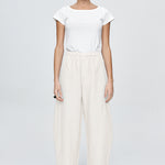This seasons iteration of The Ellidy Pant is crafted in a linen / cotton, this textured cloth gives the pant more structure. They feature a simple barrel shape leg, falling to an ankle length. These pants sit on an elasticated waistband and feature patch pockets with bar tacks at the pocket mouth, accentuated with tonal top-stitching.