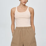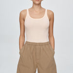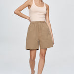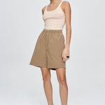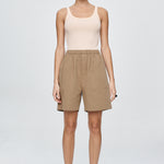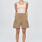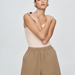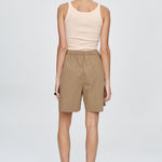 Relaxed-fit shorts crafted from a lightweight 100% cotton selected for its crisp structure and comfort. The design features a fully elasticated waistband for ease of wear and flexible fit. A mock fly is incorporated at the centre front to reference traditional tailoring details while retaining a pull-on construction. The Ren short is equipped with oversized front pockets and finished with a topstitched deep hem.