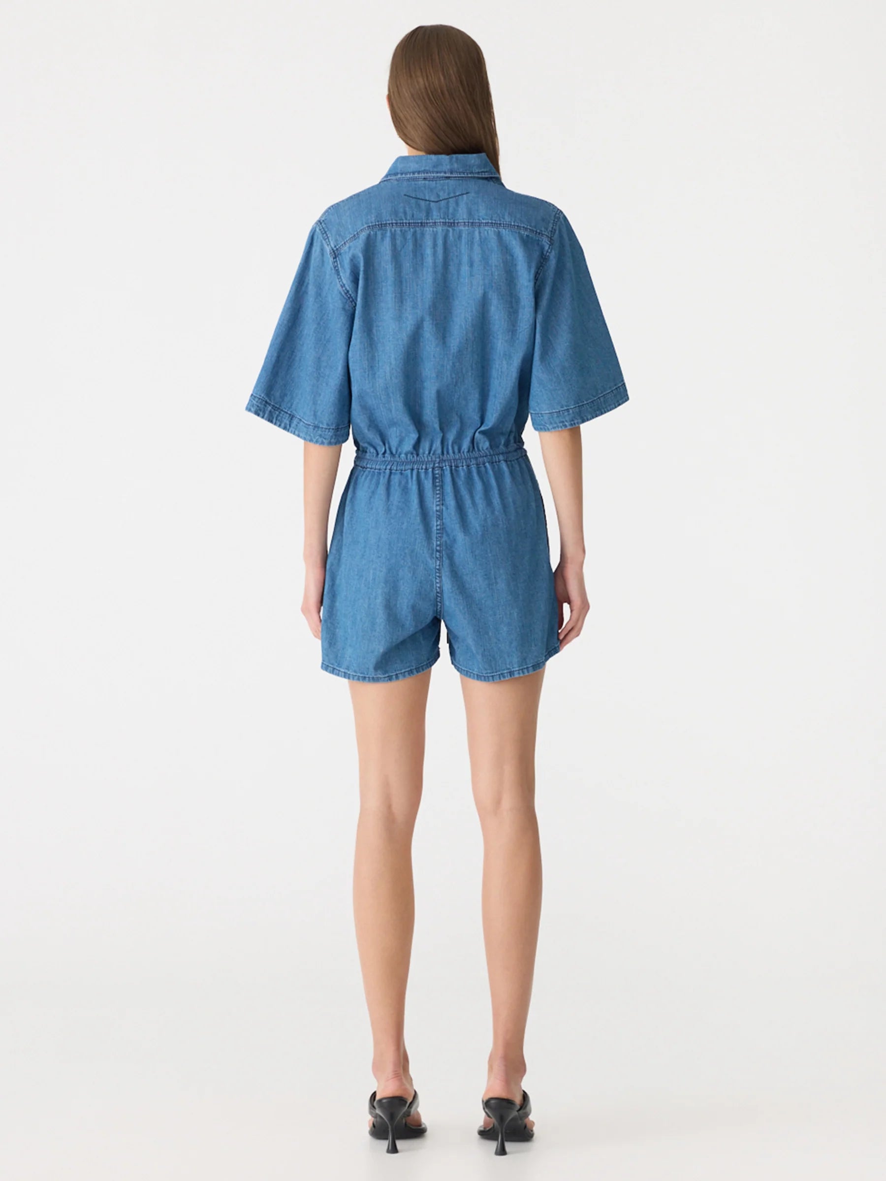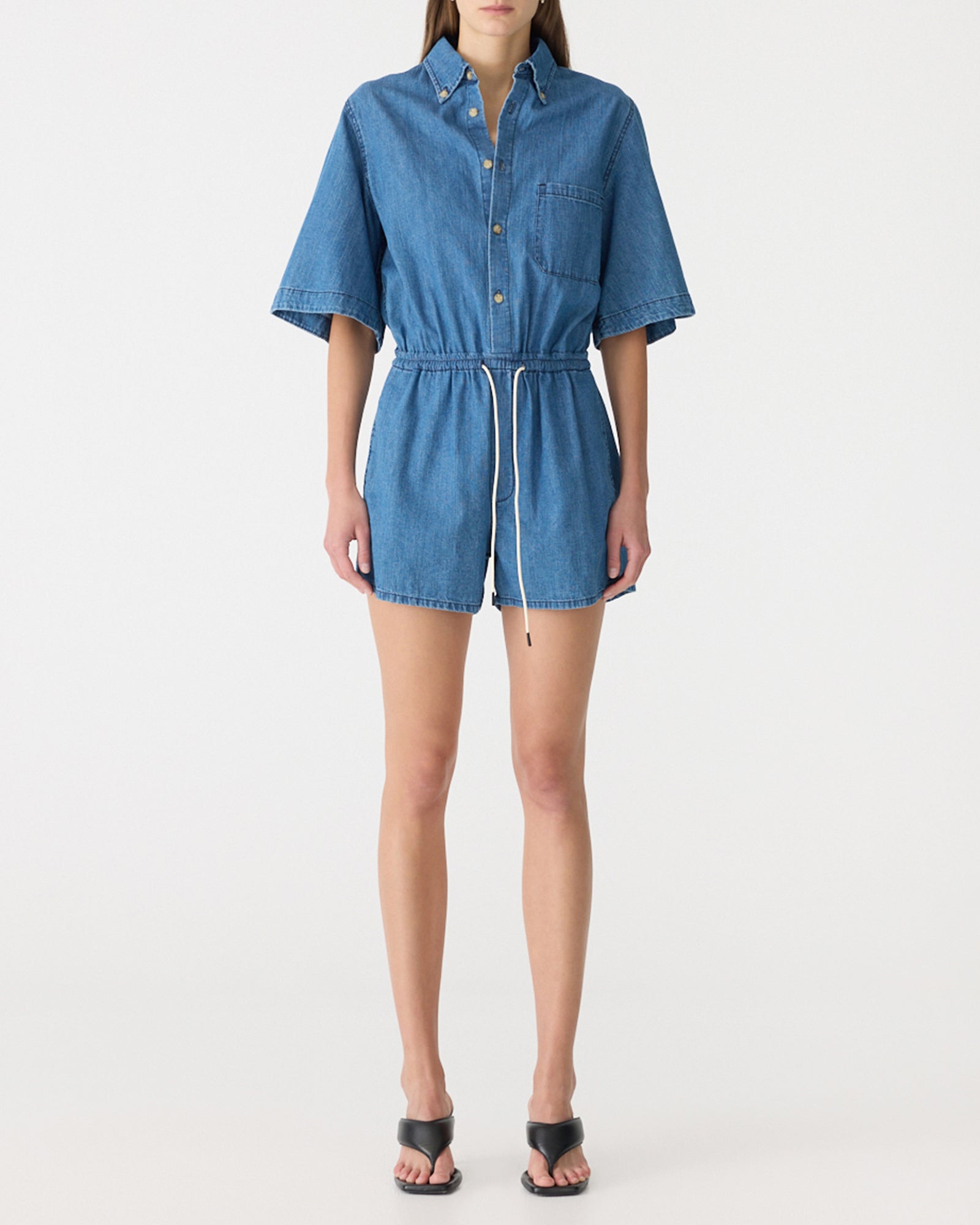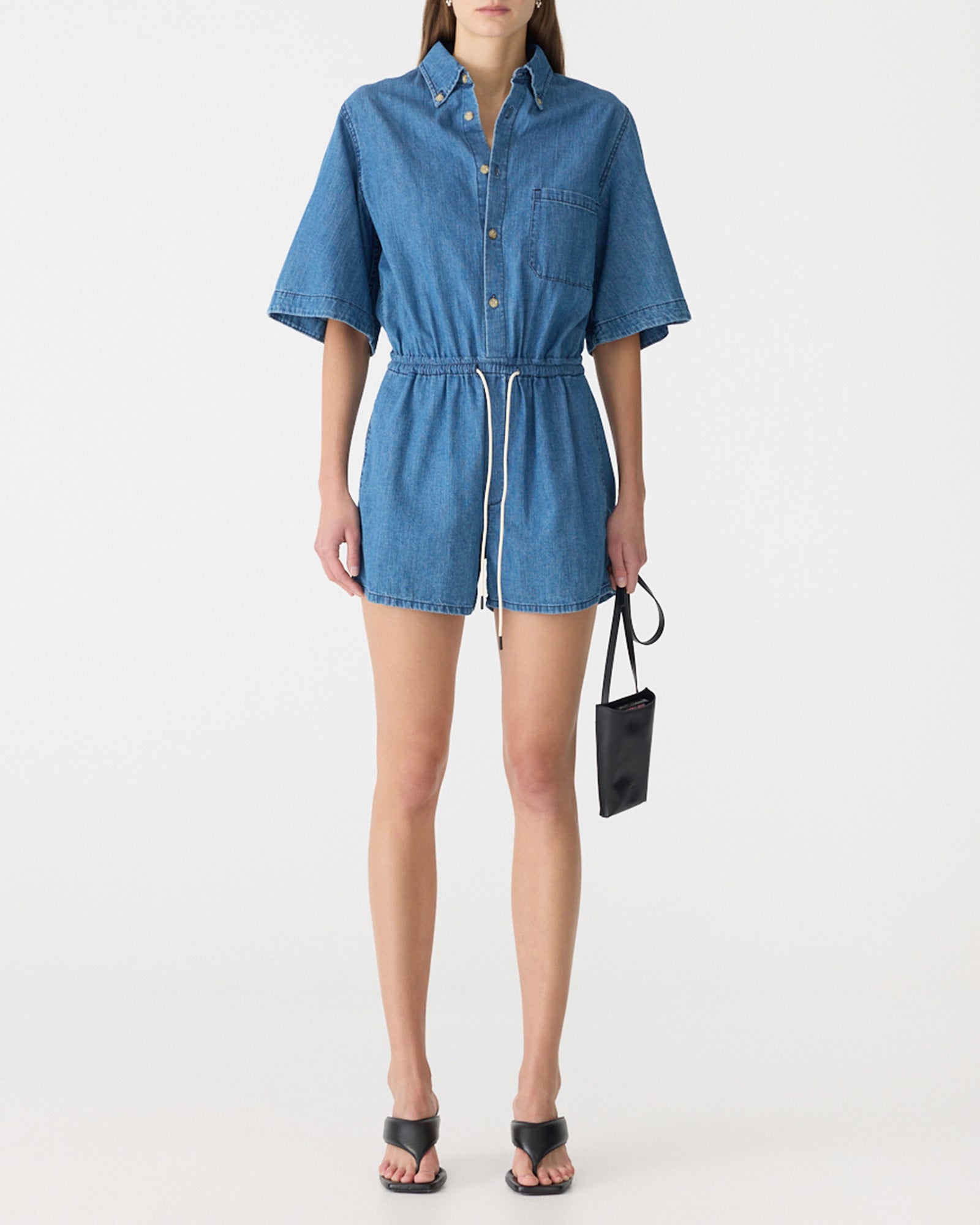 Crafted from organic lightweight denim cotton made in Japan, the Organic Denim Jumpsuit is designed for a regular fit. This short-sleeve style features a buttoned centre-front placket and collar, with a fine elasticated waistband and pre-made drawstring. Detailed with topstitching throughout, it is finished with a left front patch pocket, back yoke, faux fly on the short and side-entry pockets.