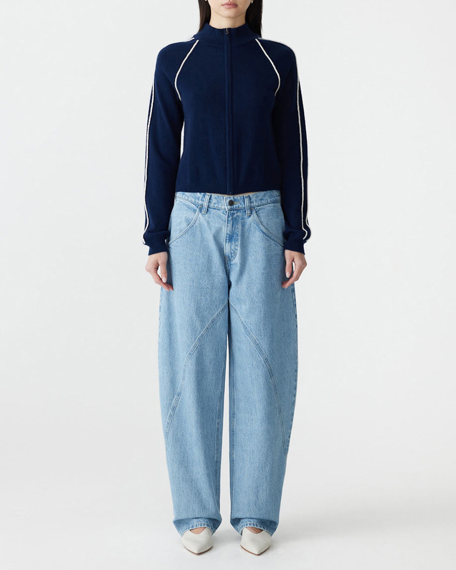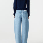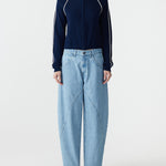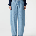 The Panelled Curved Leg Jean is designed with a sculptural curved silhouette and clean panelled detailing through the front legs. Featuring wide curved front pockets, back patch pockets, and a concealed zip fly with denim shank button closure. Finished with lap and fell construction and contrast topstitching throughout. Crafted from heavyweight organic cotton twill woven in Japan.