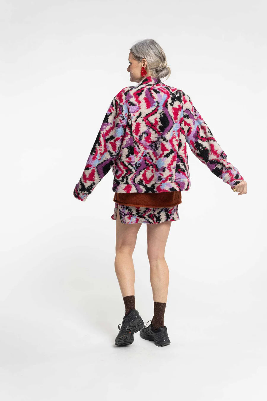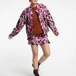 Designed with a modern bomber profile, it features clean lines and a cropped length that sits perfectly over dresses, skirts, or trousers. The vibrant Flash dance pattern adds a statement element, balancing colour and texture with an effortless sense of individuality.