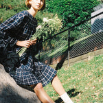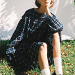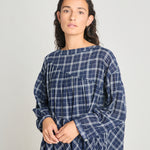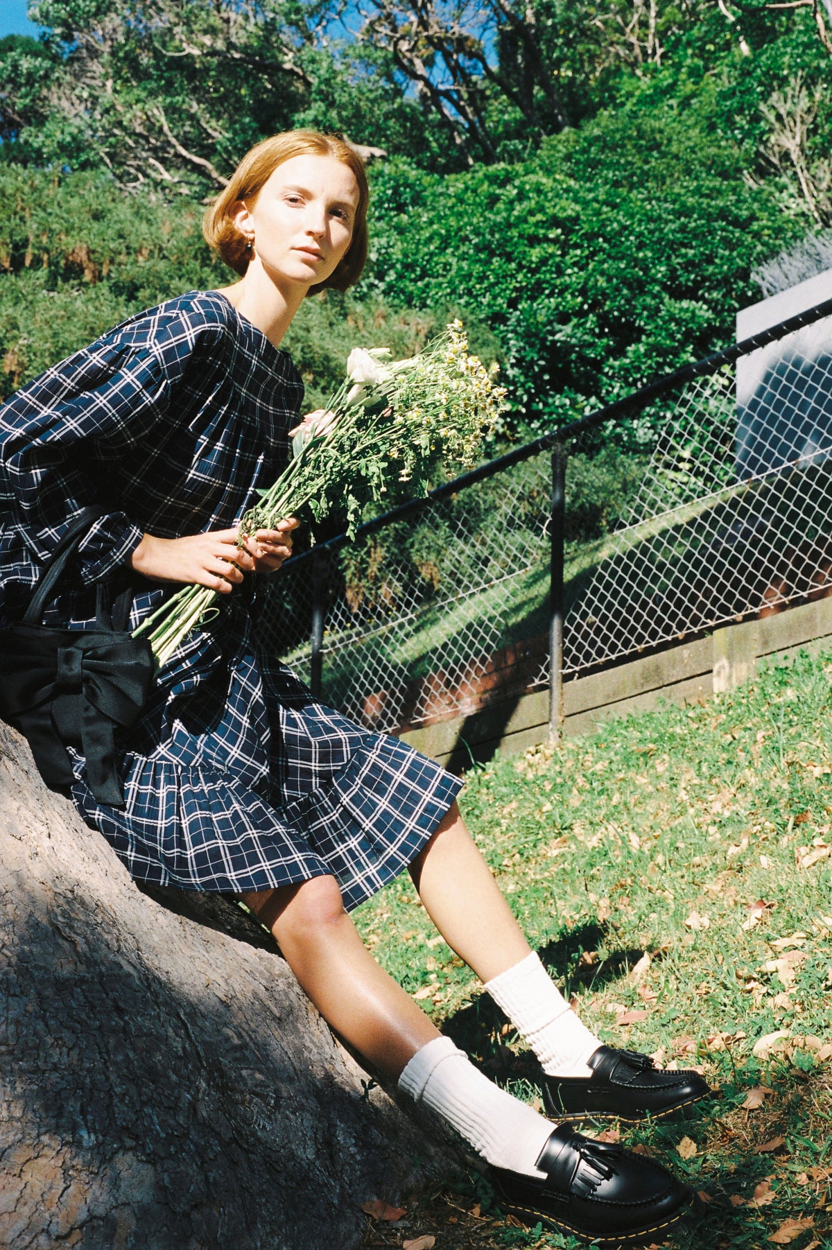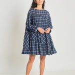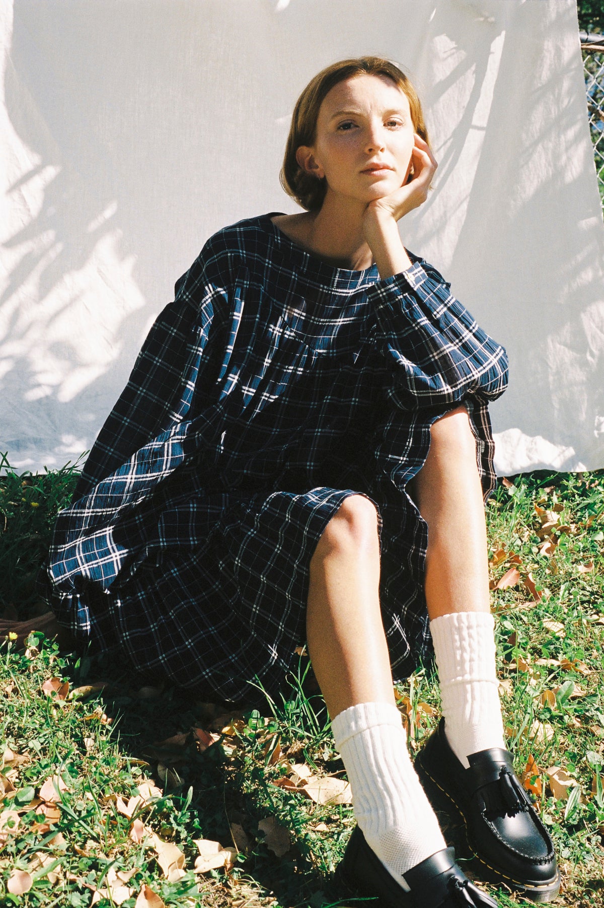 The Unconscious bias dress takes shape in navy plaid cotton: with long, gathered sleeves, multiple asymmetric gathered tiers, and a bias-cut panel. Not to play favourites but there's just something about this one.