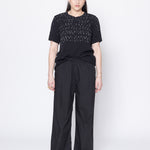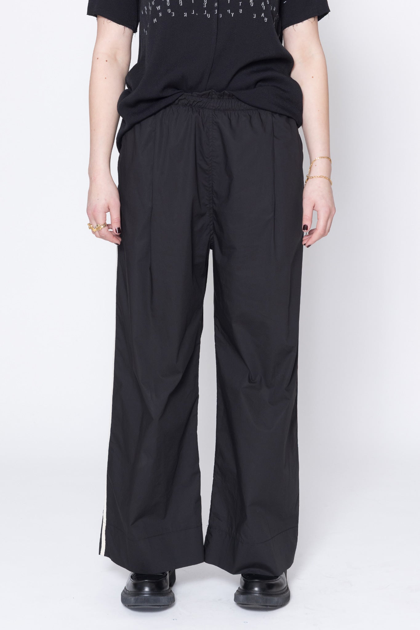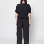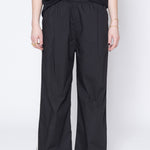 Wide leg pants in a crispy cotton shirting, designed for a relaxed to oversized fit. Easy pull on elasticated waistband with front pleat, inseam pockets and narrow grosgrain tuxedo stripe down side leg. These pants will be your new wardrobe go-to's, worn with the Entitled Tee.