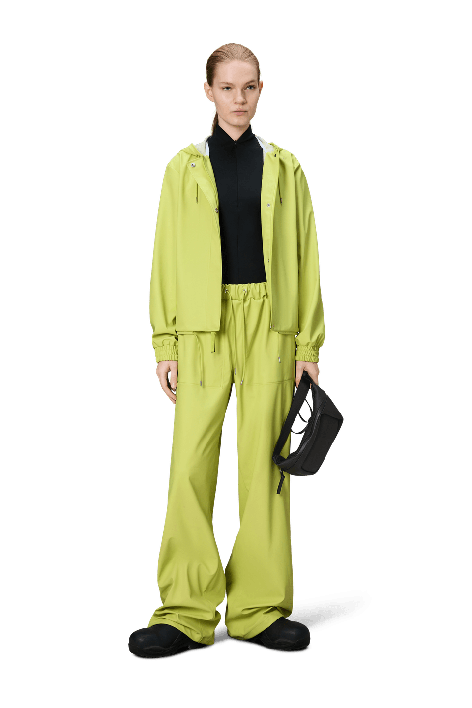 String W Jacket is cut from Rains' signature PU fabric and features welded seams. The finish is lightweight with a smooth feel.