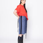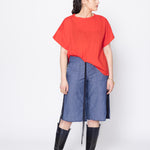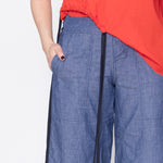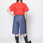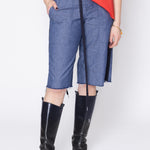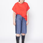 Wide leg, mid to low rise shorts in a light cotton denim, designed for a relaxed fit. Fitted through the hip with button fly, featuring side patch pockets, wide grosgrain down side leg and raw hem. Great casual or dressy shorts, worn with the Neurotic Tee.
