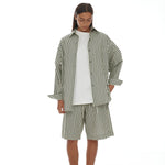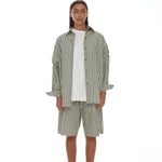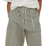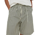 Elasticated waist with drawstring closure, knee length, relaxed fit short with side seam pockets. In custom 100% cotton stripe print.
