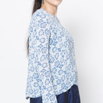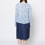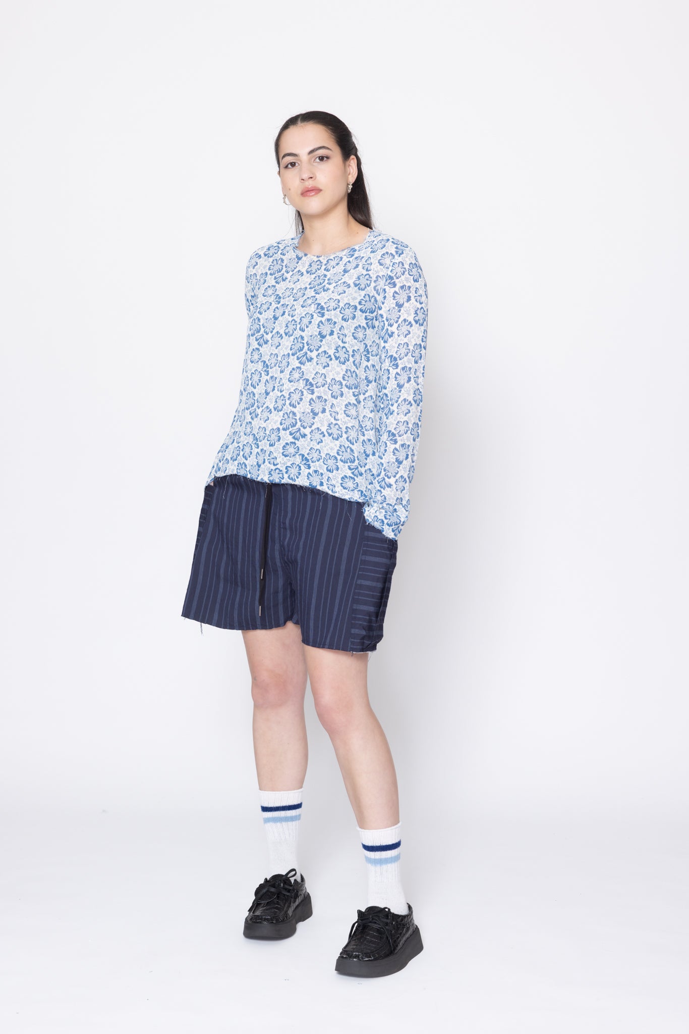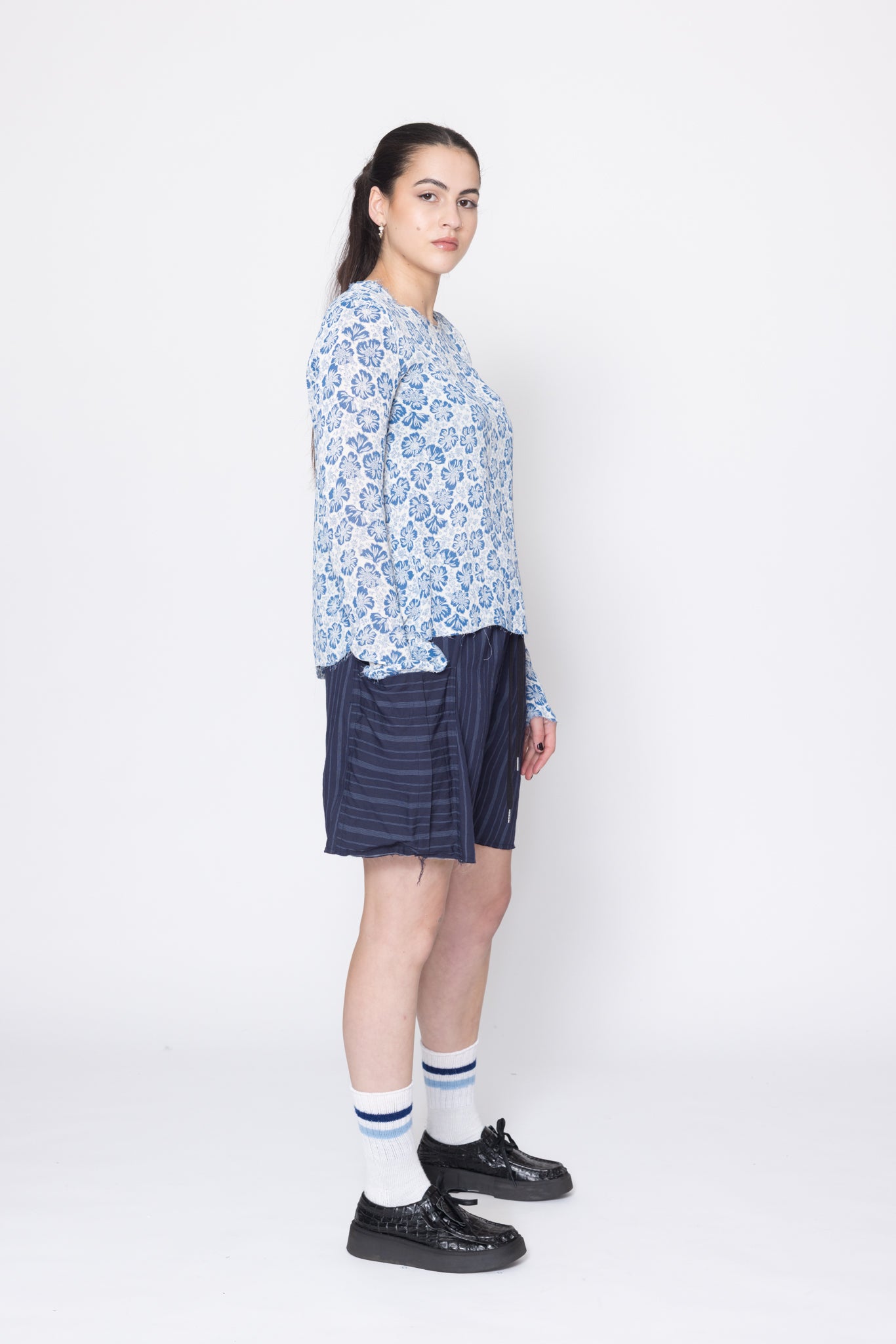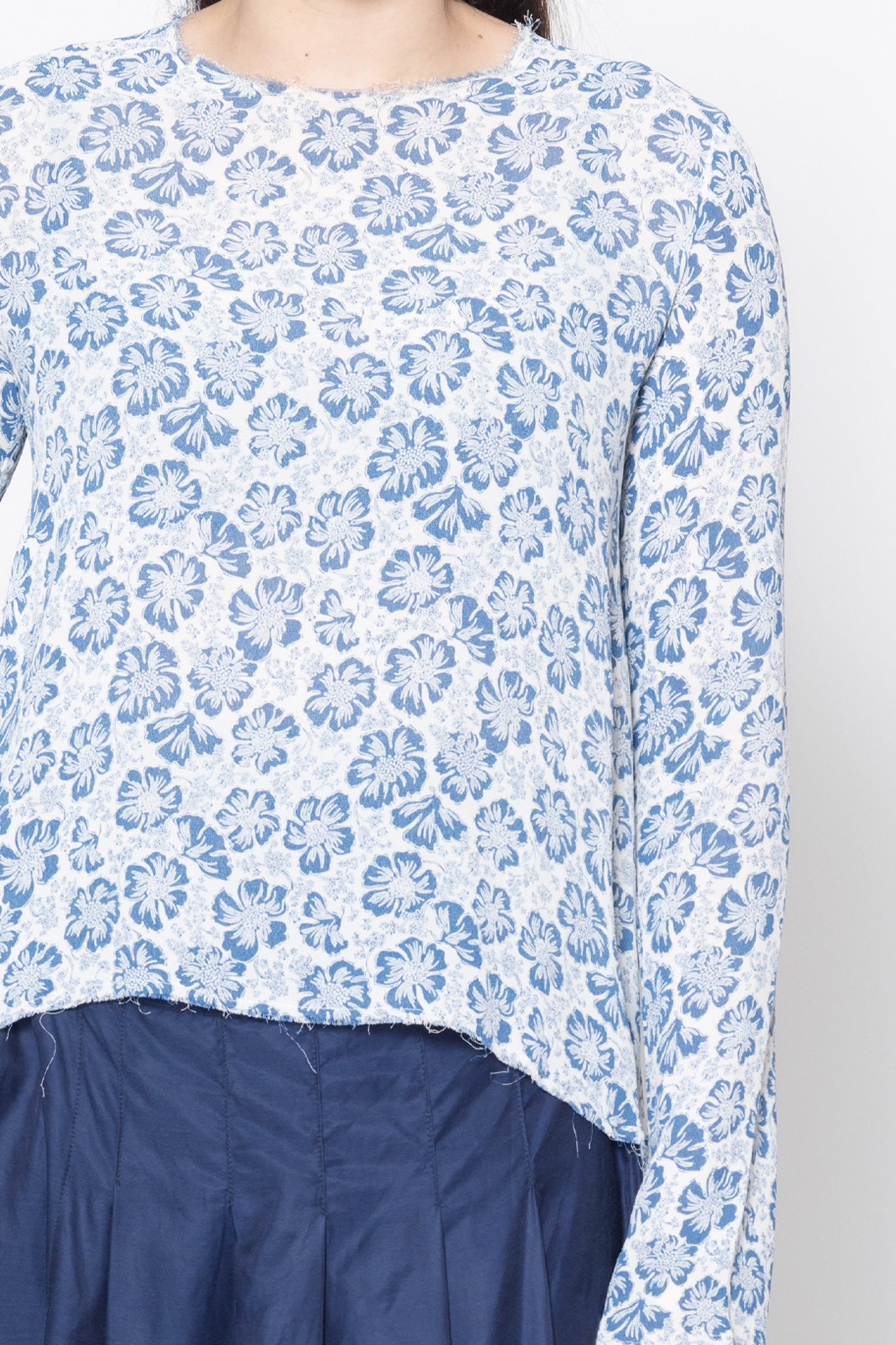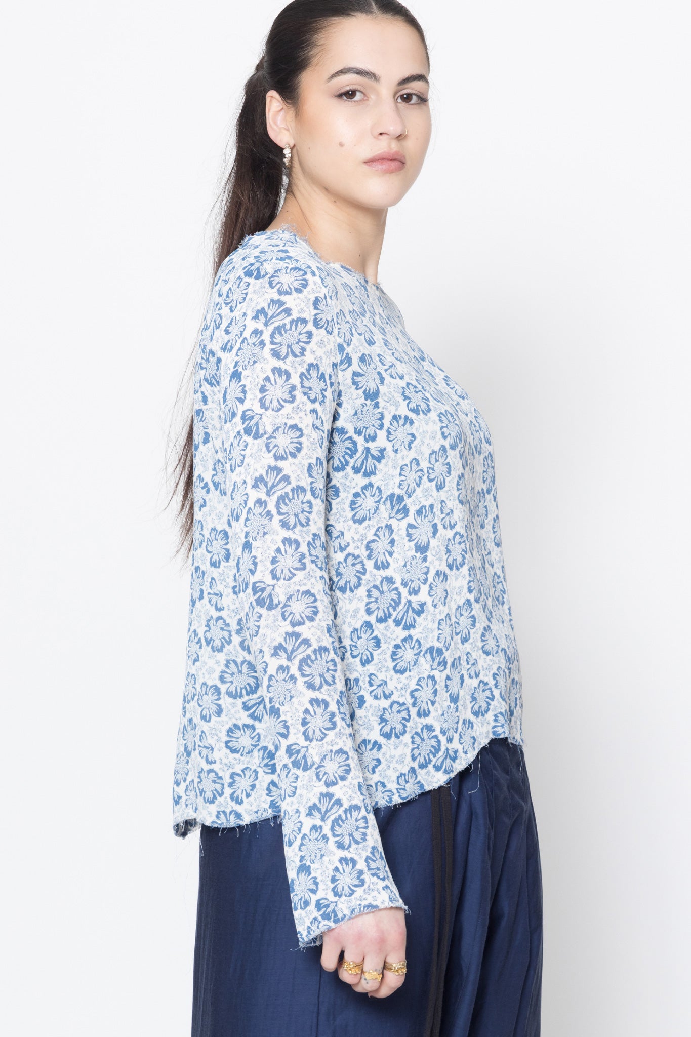Long sleeve top in floral printed Lenzig viscose georgette, designed for a slim to relaxed fit. Featuring a round neck, raw hems and slightly flared sleeve hem. This is a great summer layer, worn as is or underneath dresses, worn with the Reality Skirt and Persona Shorts.