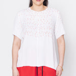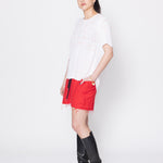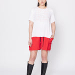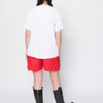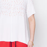 Short sleeve top in viscose twill, designed for a slim to relaxed fit. Individually hand printed with our signature Scatter print in red. This print is designed in house, the artwork is reflected song lyrics by Screamin' Jay intended to be revealed in a mirror. Featuring a round neck, raw hems and front french seam. This is a great summer top, worn with the Persona Shorts.