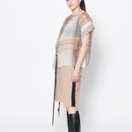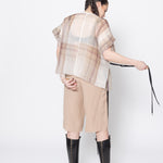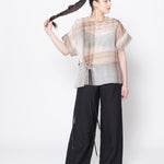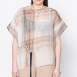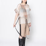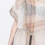 Short sleeve tee in sheer plaid silk organza, designed for an oversized fit. Featuring a round neck with raw neck trim, dropped shoulder with doubled sleeve, front curved casing with ties to cinch in or wear relaxed. This is the perfect summer tee, worn with the Joy Pants and the Polar Shorts.