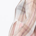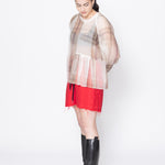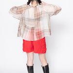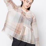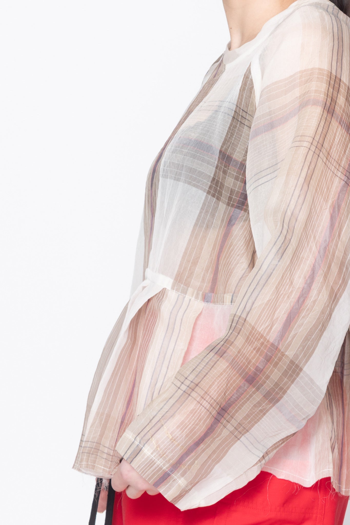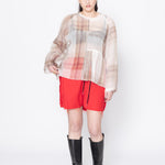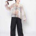 Long sleeve sweater in sheer plaid silk organza, designed for an oversized fit. Featuring a round neck with classic neckband, raglan sleeves and wide pleating at one side both front and back. This is an easy go-to sweater, worn with the Privilege Pants and Persona Shorts.