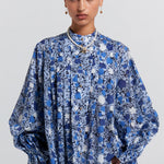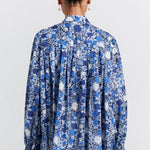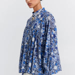 Made from breathable organic cotton, the Furrow Shirt features the Perfect Day print, a whimsical floral design in a harmonious blue palette. The shirt offers a relaxed fit with a subtle pleated design. The button-up closure down the middle leads to a neat neckline, while the billowy sleeves finish with cuffs that flare out into a ruffled design.