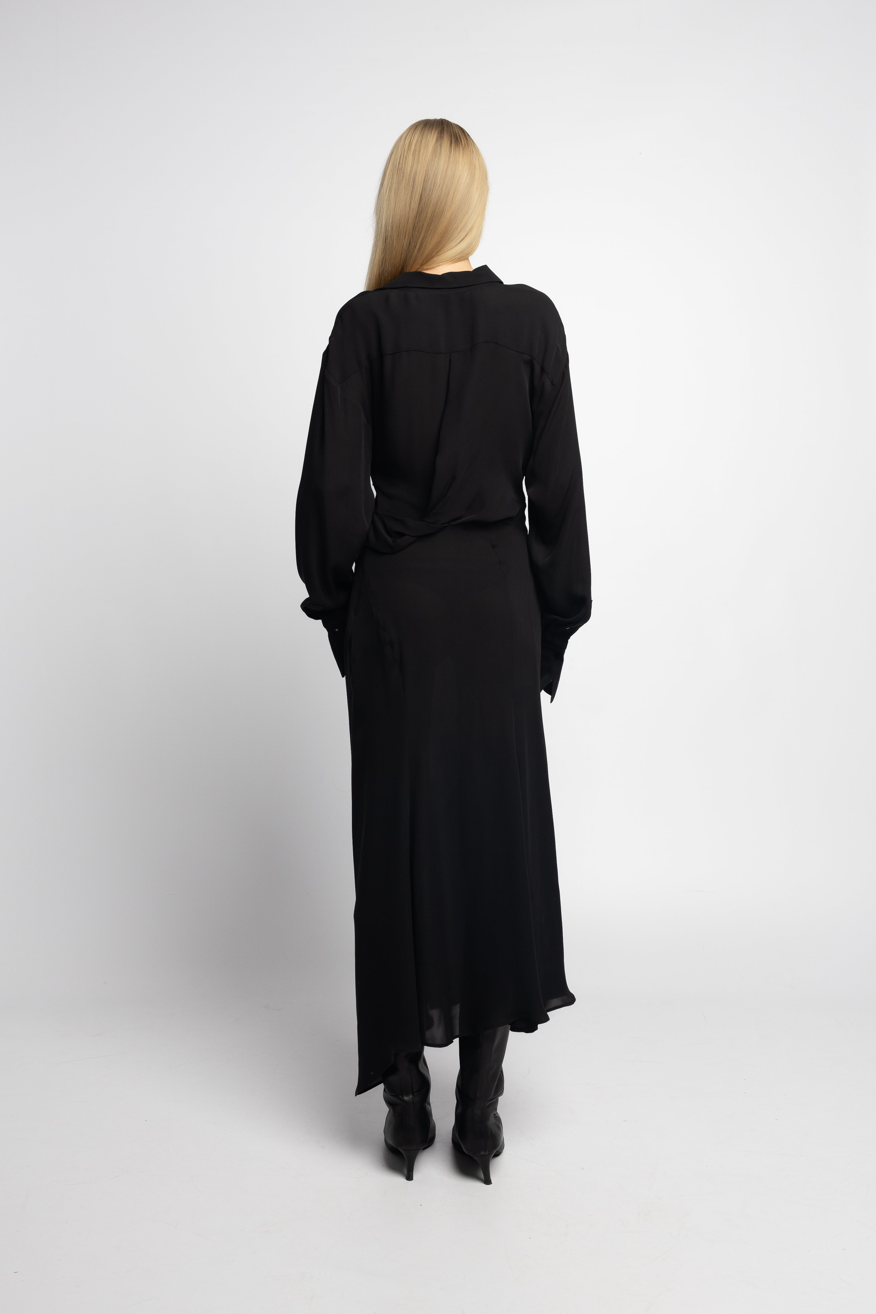 The Marq Twisted Shirt Dress in silk takes a structured silhouette and softens it with luxurious drape. The black silk brings a refined fluidity to the twisted detail, making this piece easy to elevate—minimal effort, maximum presence.