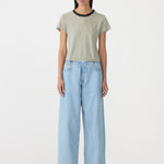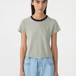 A high-rotation essential, the Stripe Raw Edge Baby T-Shirt is crafted from a lightweight recycled cotton jersey in a Japanese stripe. Designed for a slim fit with a cropped silhouette, this signature style features a classic crew neckline and cap sleeves. Finished with a raw edge hem and Bassike’s contrast stitch detailing at the back neck.
