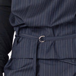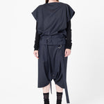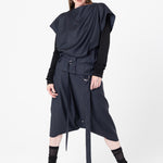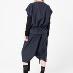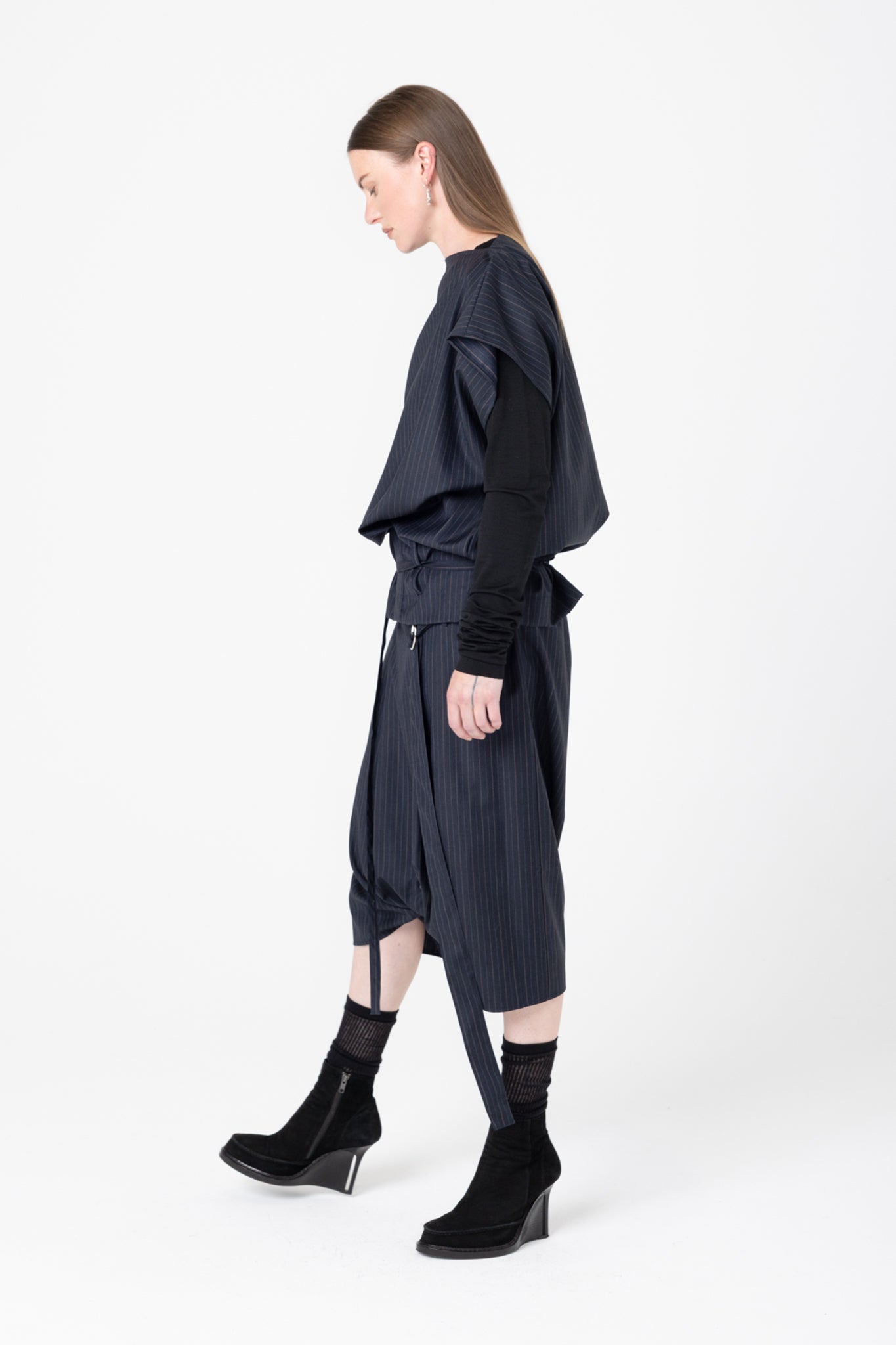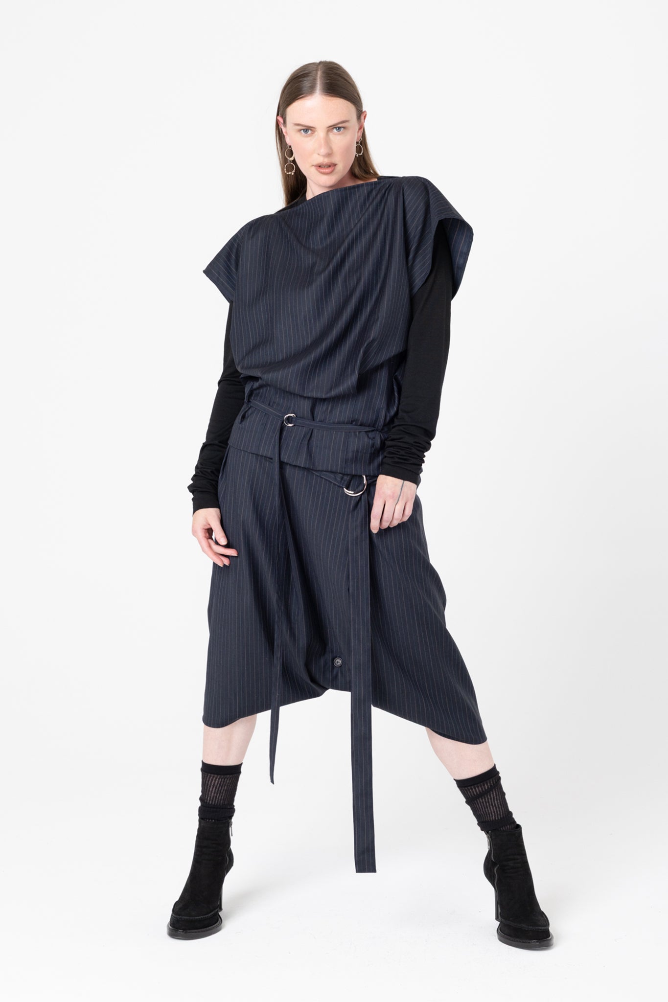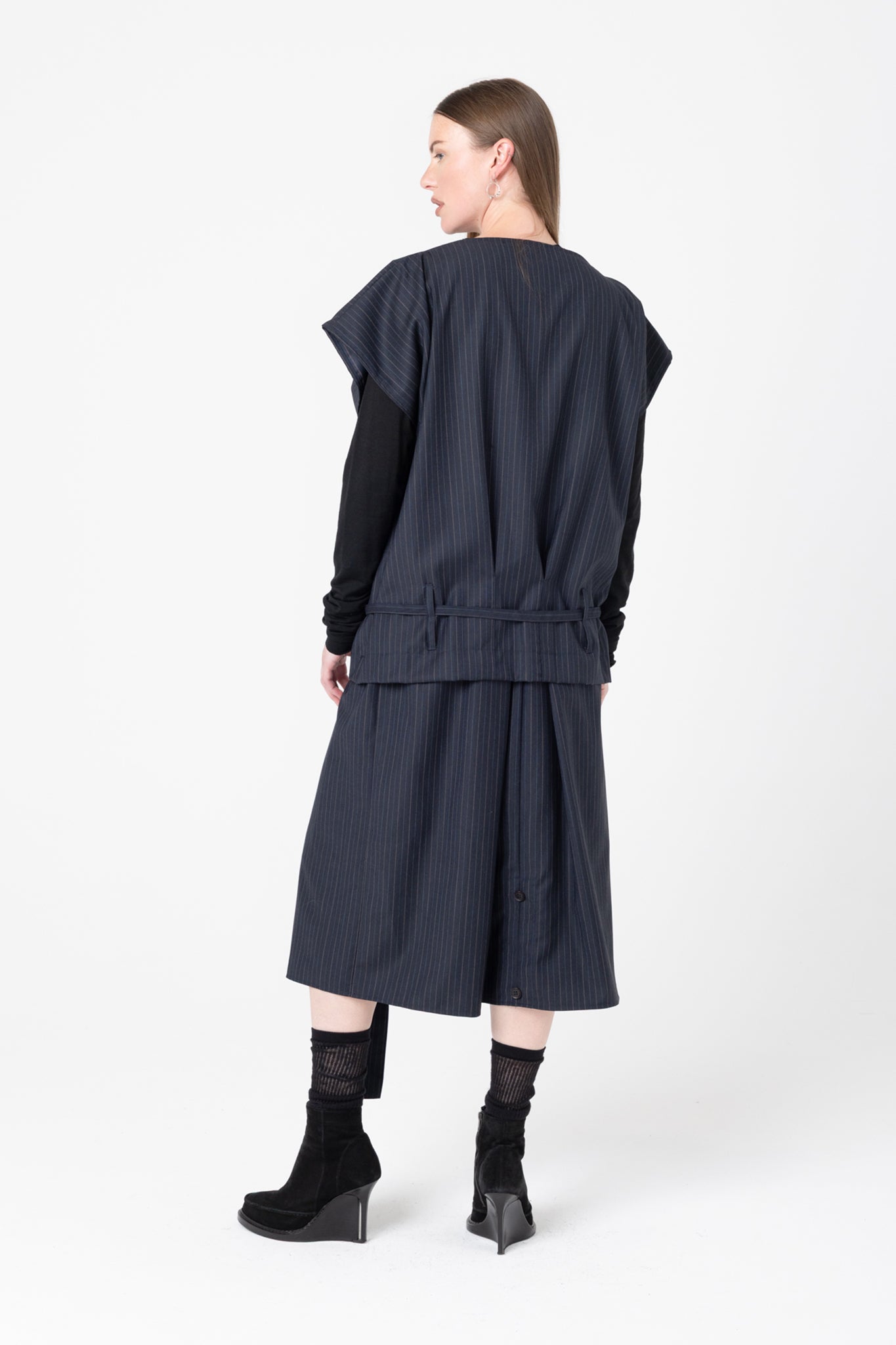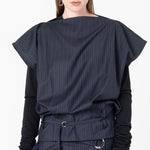 Sleeveless top in a wool stripe suiting, designed for an oversized fit. Boat neck style with front and back pleats featuring a narrow belt with D rings, two-tier belt loops and detail topstitching. Adjust the belt to wear cinched at the waist or low on the hips. A statement layering piece, designed to style over long sleeves, shirts or dresses. Worn with the Dial Up Tee and Transform Skirt.