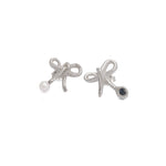 Mismatched bow studs with a 2.5mm Australian blue sapphire and a 4mm freshwater pearl