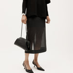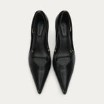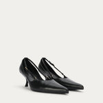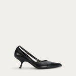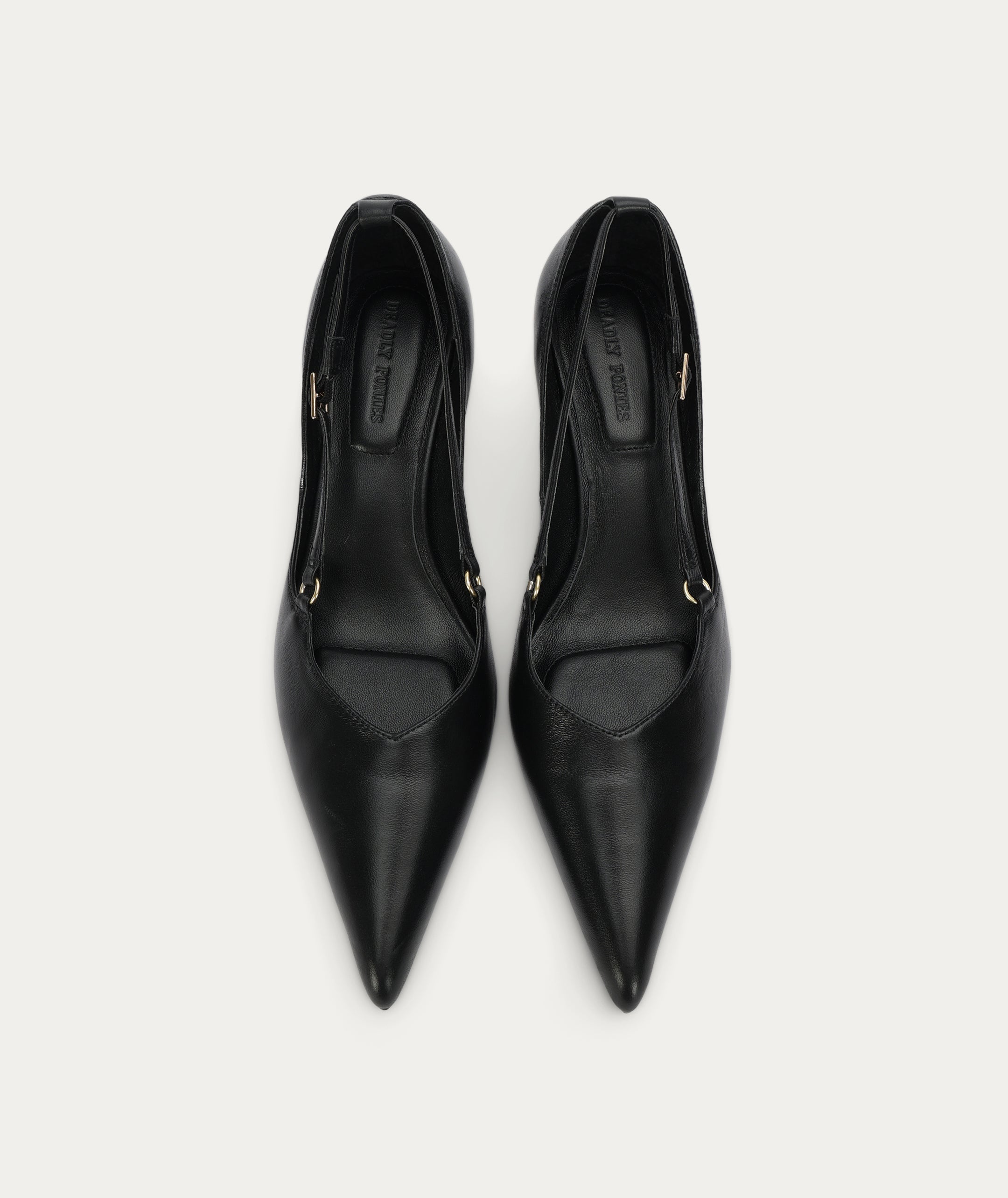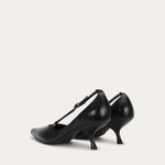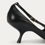 The chic Epona Heel in Black is crafted from LWG-certified Lamb Nappa. It features a pointed toe, tapered heel, leather strap with buckle closure, and padded fixed insole.