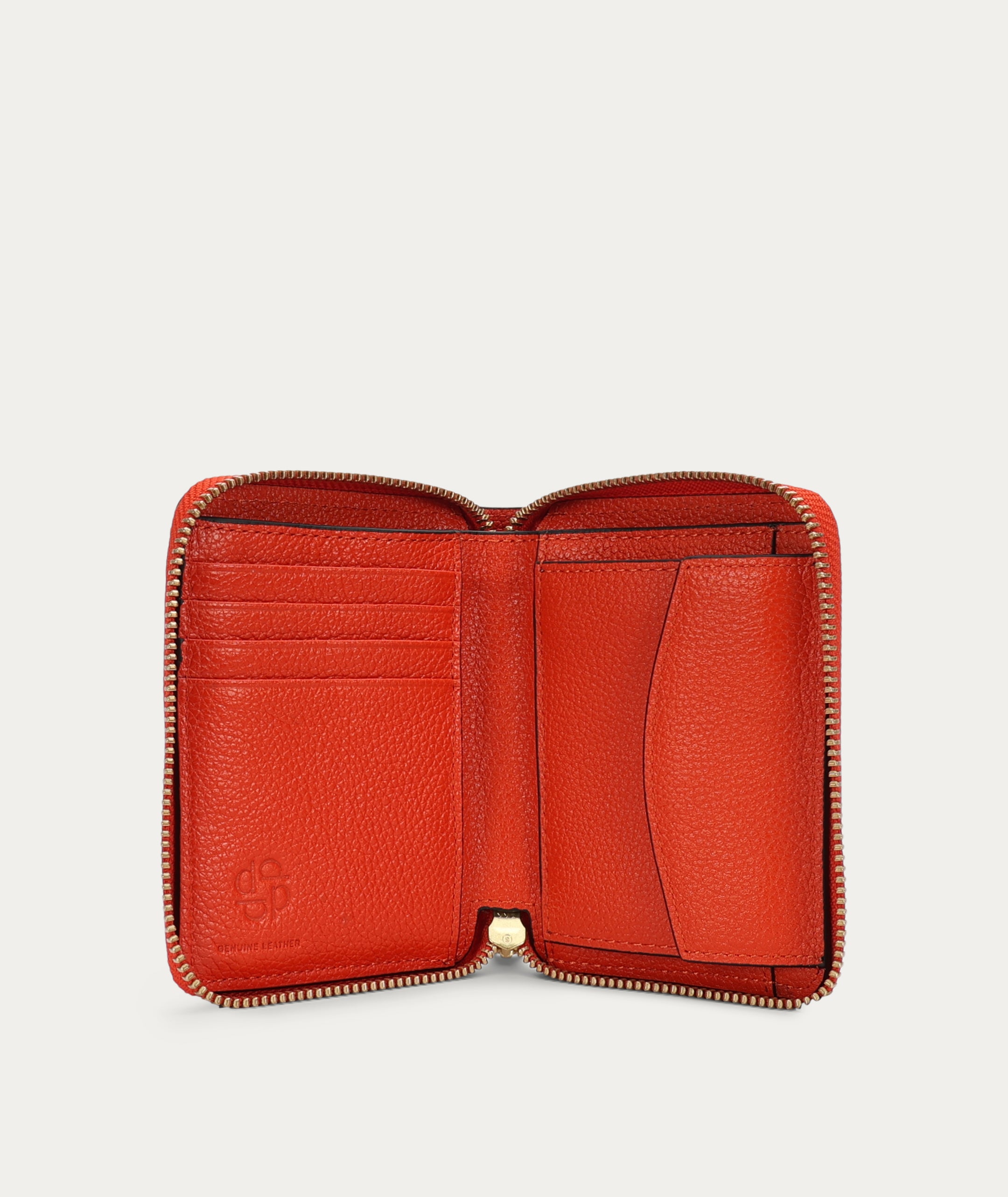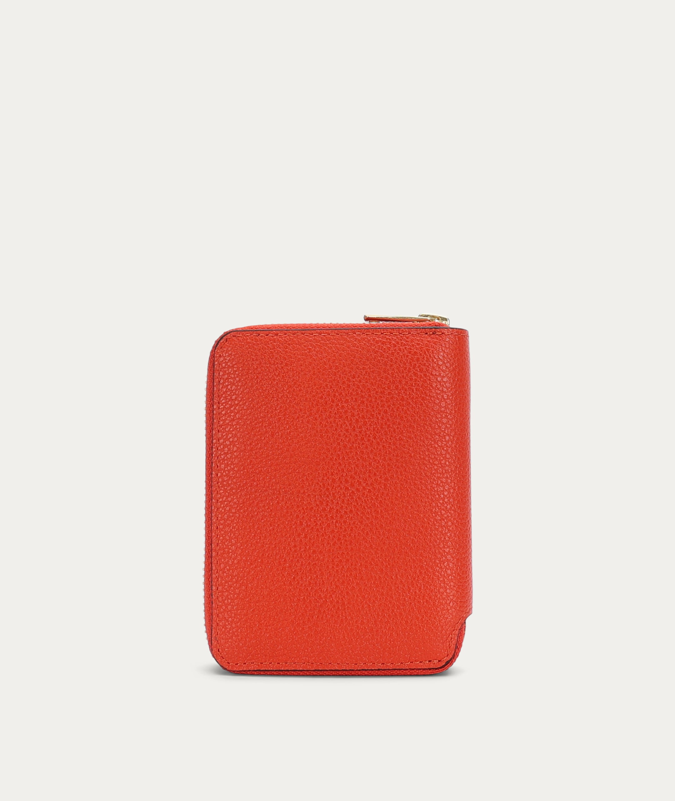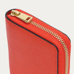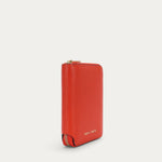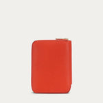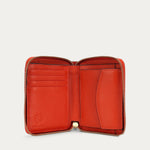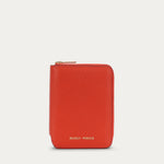 Mini Wallet in Tamarillo is crafted from Grained Calf Leather. Slimline yet functional, it features a brass zip closure and offers five card slots, two cash compartments, and a domed coin pocket.