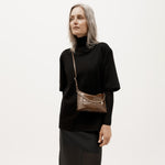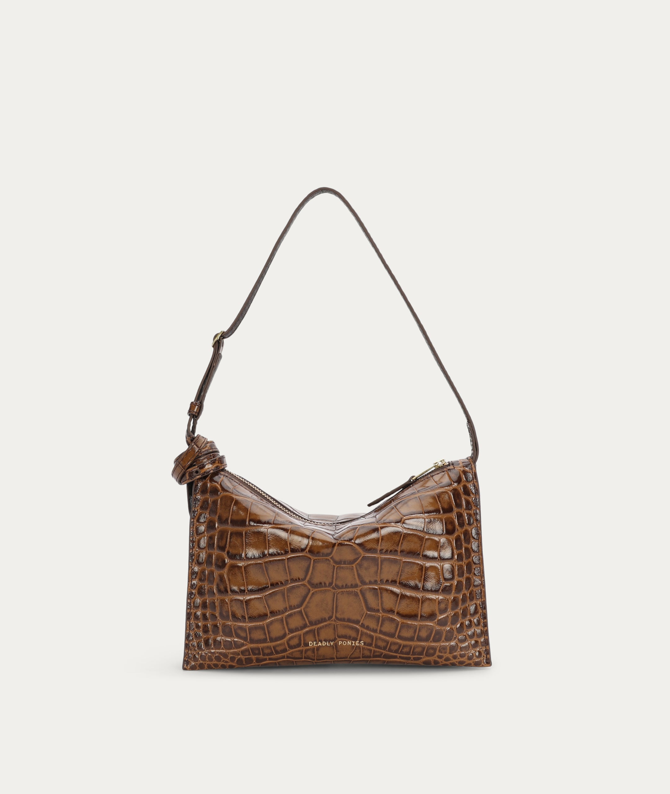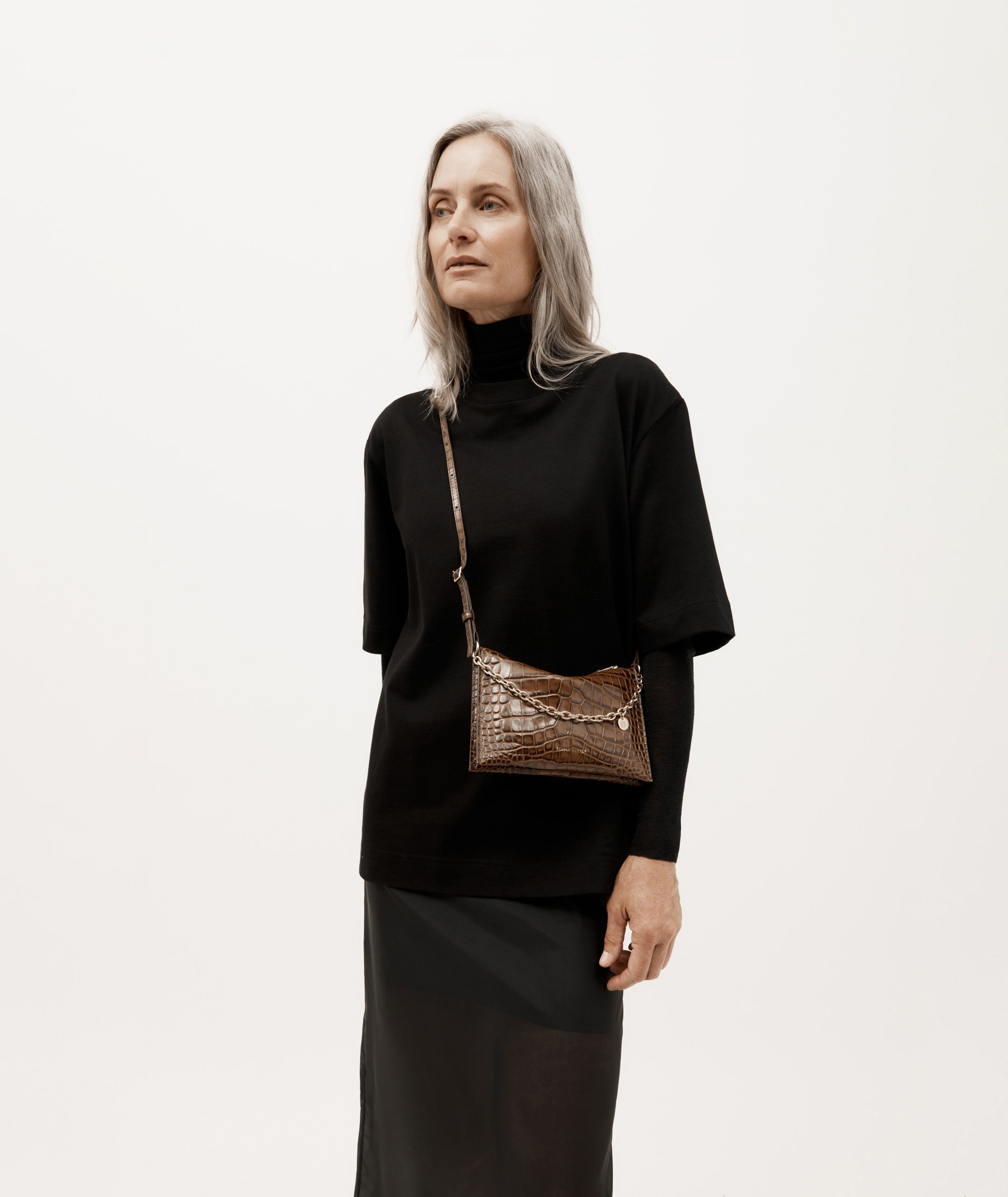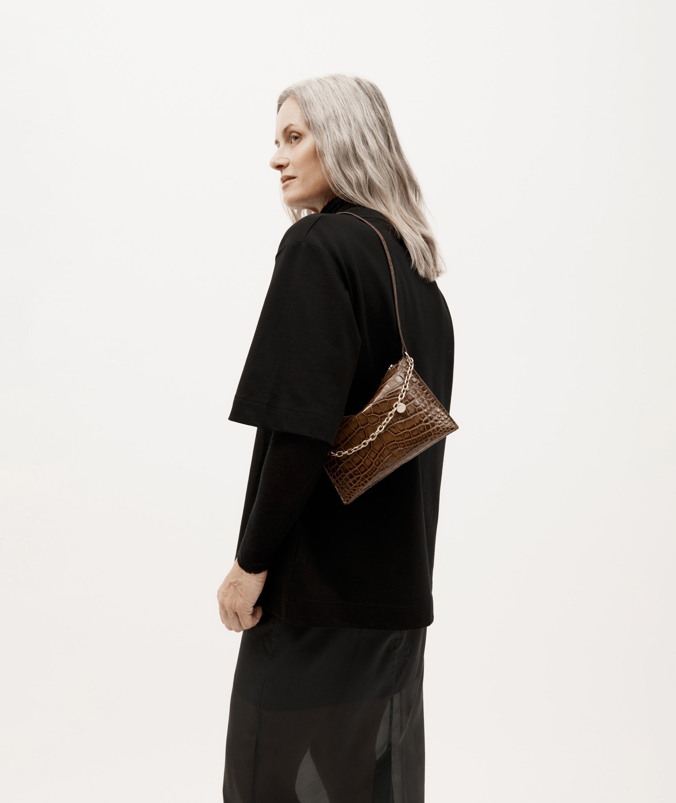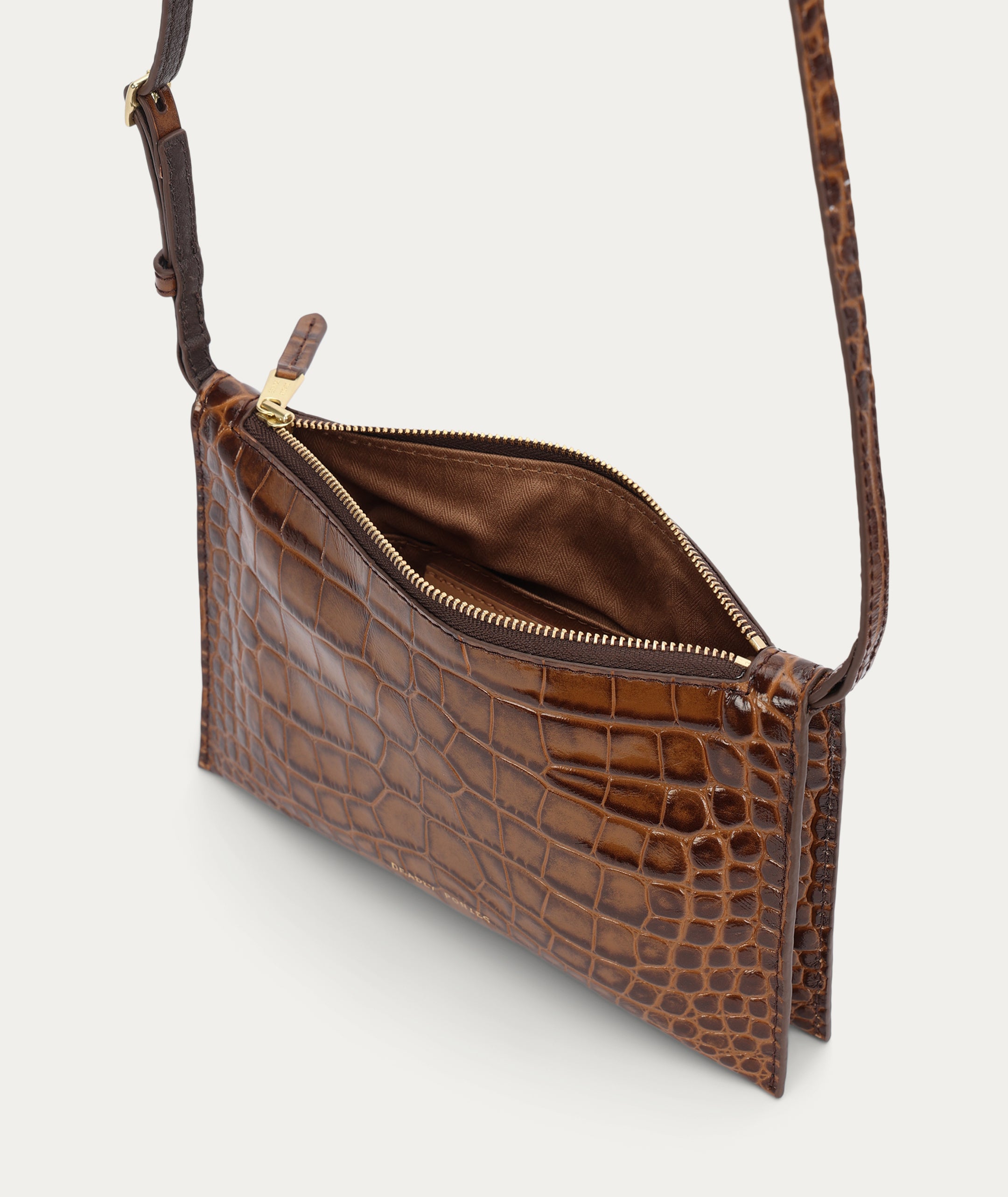 Mr Minimese is a lightweight, compact double-gusset clutch crafted from a single piece of LWG-certified Croc-embossed Calf in Toffee. His folded design creates a streamlined silhouette and can be worn crossbody or as a shoulder bag with the fixed adjustable strap.
