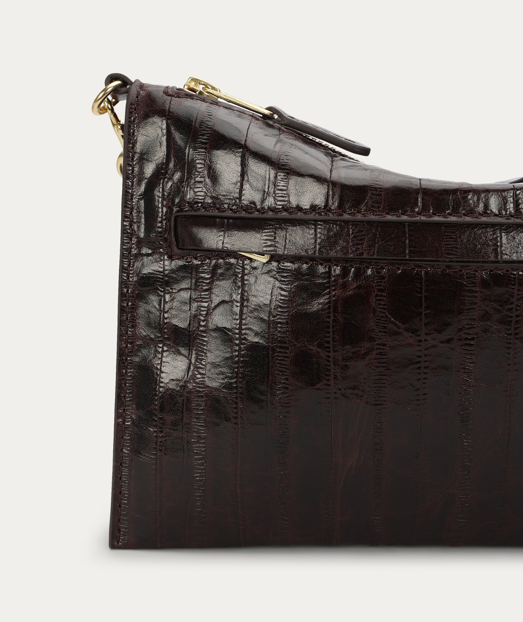 Eel Embossed Calf Leather, Leather Working Group-certified, REACH Certified Cotton Lining, Brass Hardware.