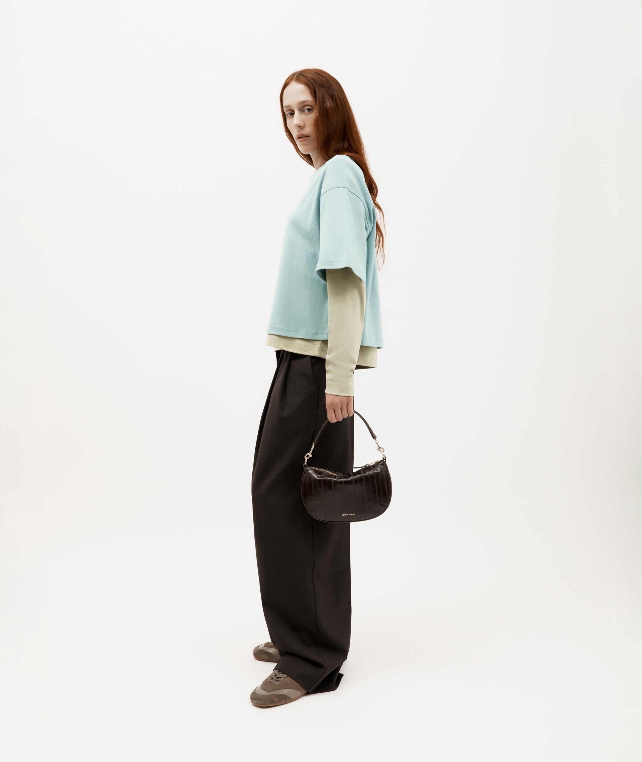 Mr Sling Micro in Java is crafted from LWG-certified Eel-Embossed Calf Leather. With a detachable top handle and adjustable strap, he offers versatile styling, while internal pockets and a brass zip closure keep essentials secure.