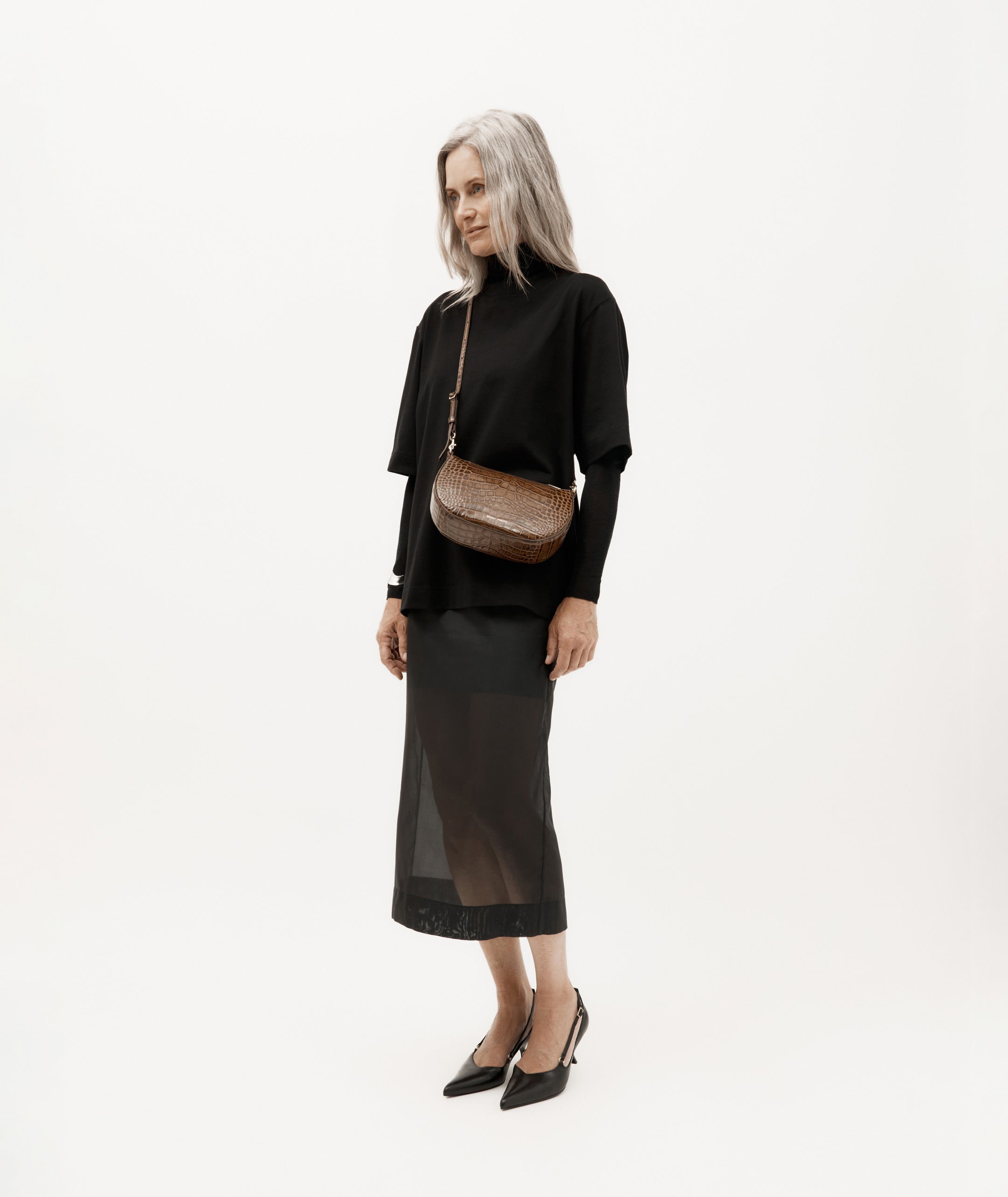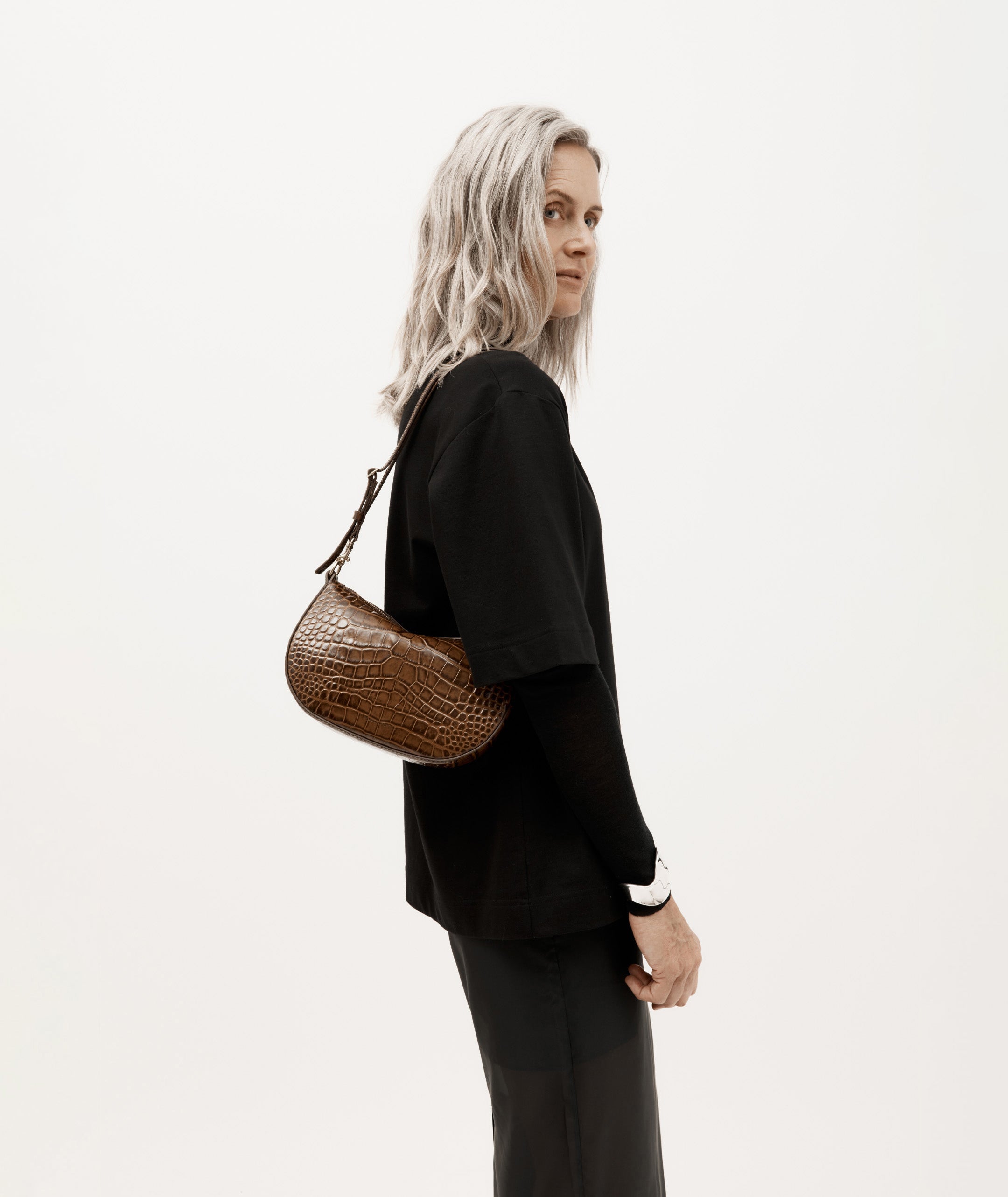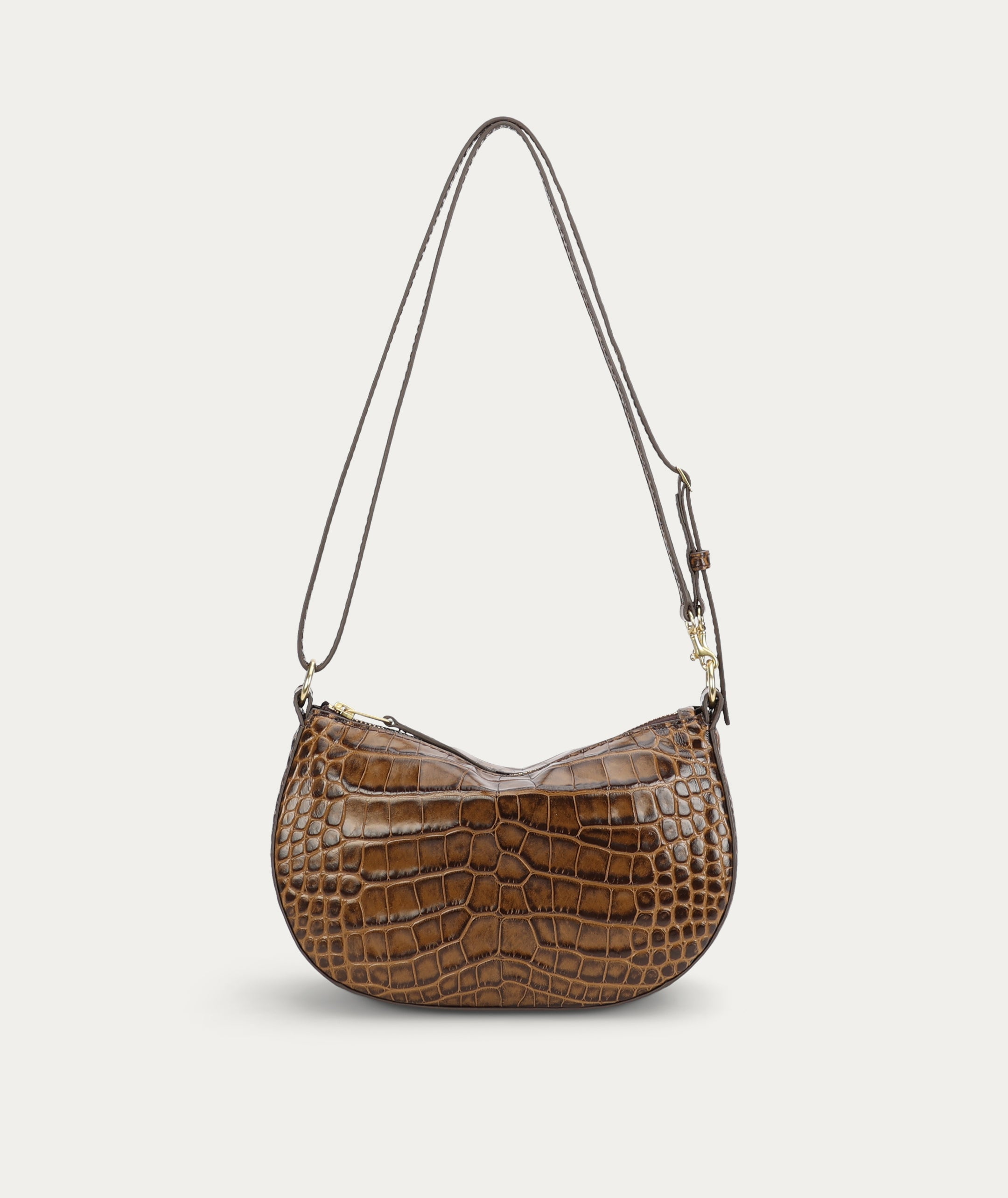 Mr Sling Micro in Toffee is crafted from LWG-certified Croc-Embossed Calf Leather. With a detachable top handle and adjustable strap, he offers versatile styling, while internal pockets and a brass zip closure keep essentials secure.