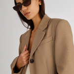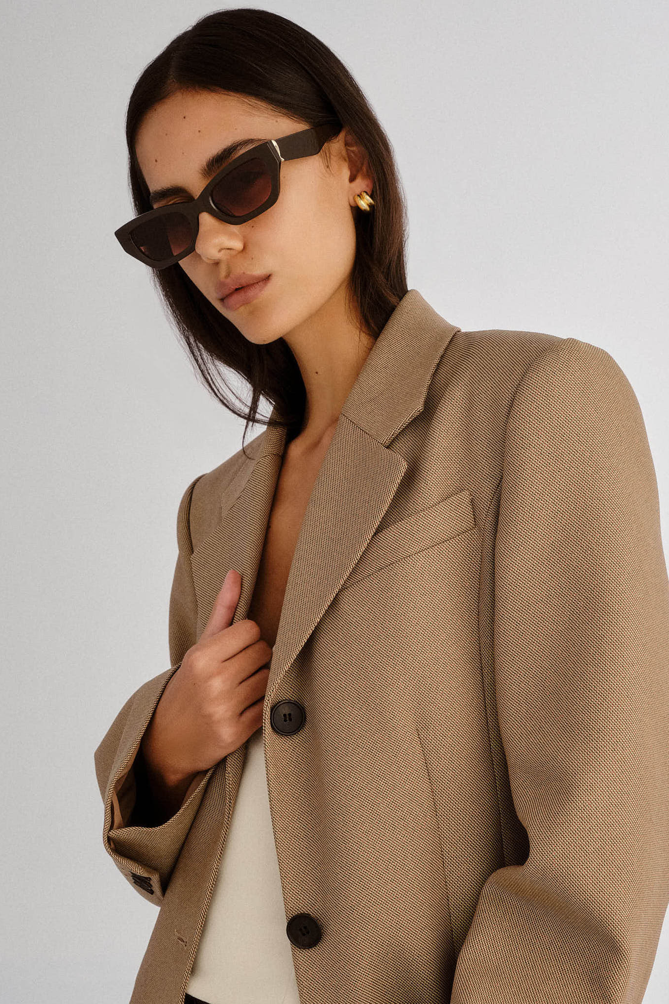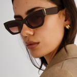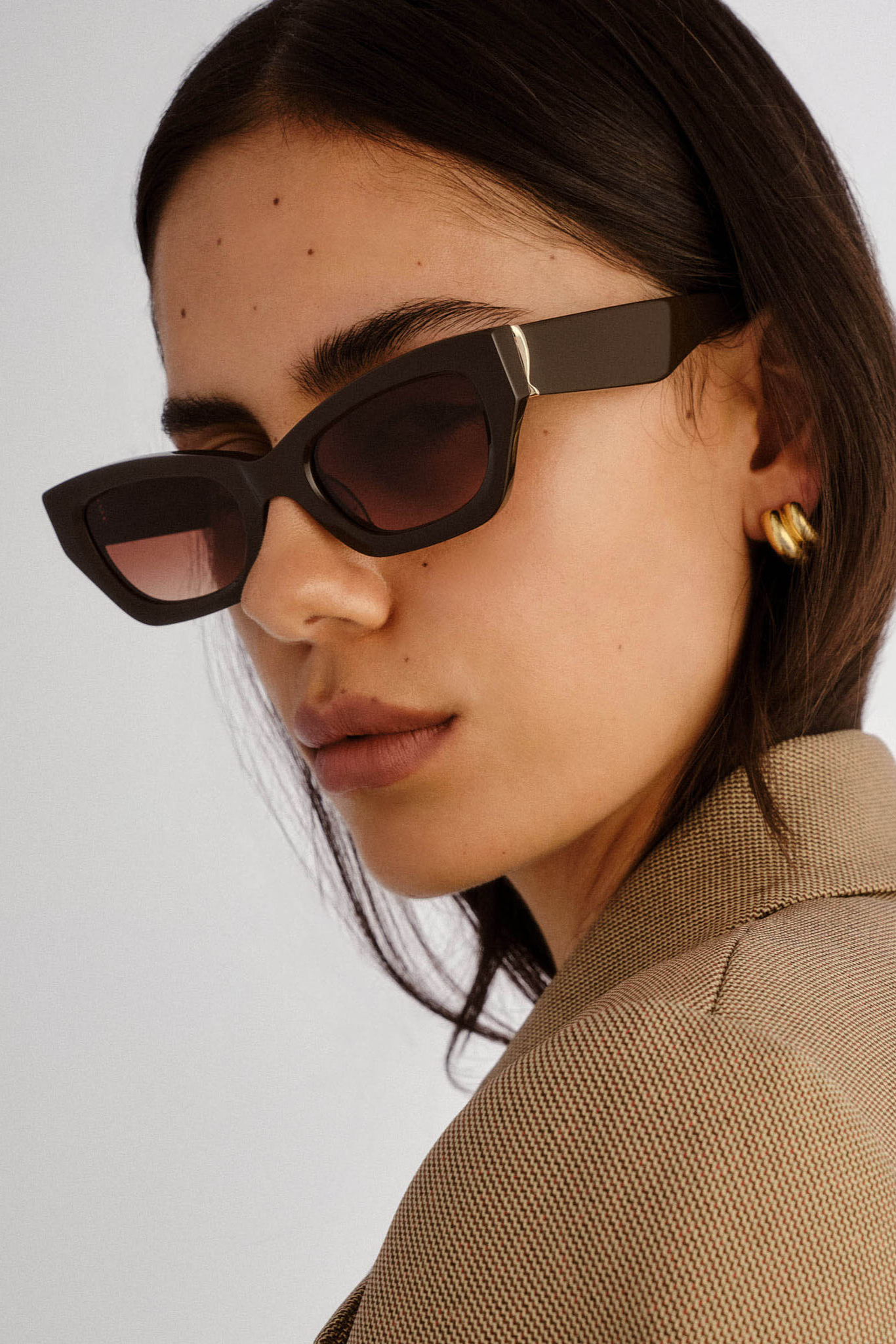 Bold in all the right ways. The Sutton is a wide cat-eye frame with sharp lines and thick temples, balanced by subtly curved metal detailing that adds a refined touch. Designed to frame the face with confidence, this style is equal parts statement and staple.