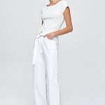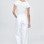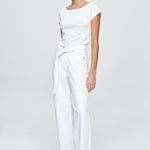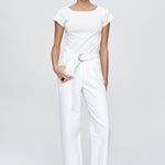 A iteration of the wide-leg jean cut in 100% organic cotton. Sitting neatly at the waist and hips. Designed with a self-fabric belt with metal D-ring hardware, allowing for subtle adjustability at the waist. Finished with a mid-rise waistband, zip and fly closure and classic five-pocket construction. Finished with topstitching to reinforce all seams for durability.