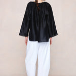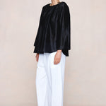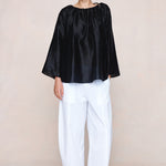Voluminous top with a gathered neckline, adjustable tie detail, full wide sleeves, subtle gathers through the front and back, and a curved hem.
