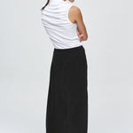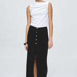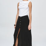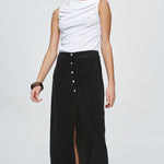 A button-through skirt cut from 100% silk for a fluid, elegant drape and natural sheen. A straight shape that softly skims the body and falls to the ankle. The front placket is finished with a line of 5 contrast shell buttons for closure. A subtle front slit adds movement and ease, while the waistband sits comfortably at the natural waist for a streamlined fit.
