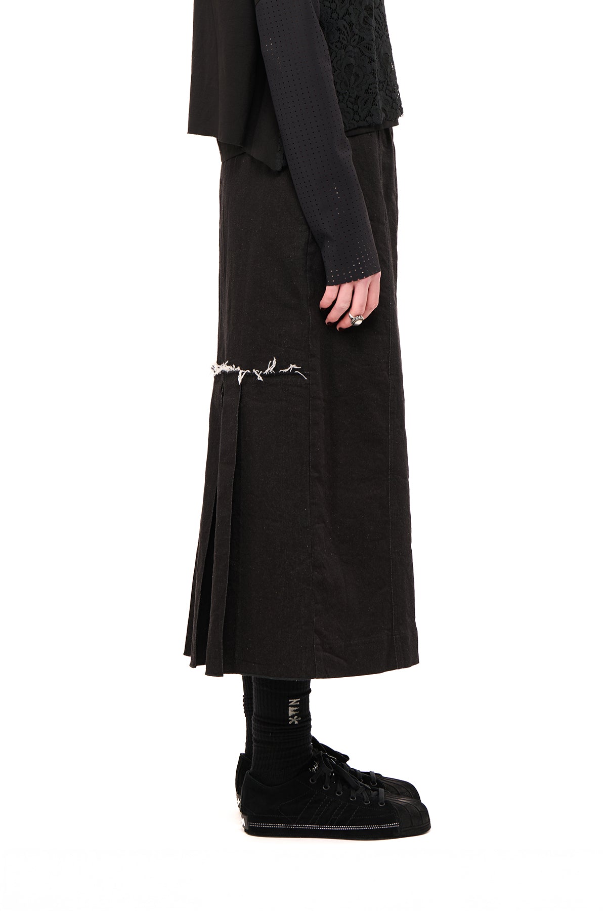 - Side 1: Pleats with raw seam detail