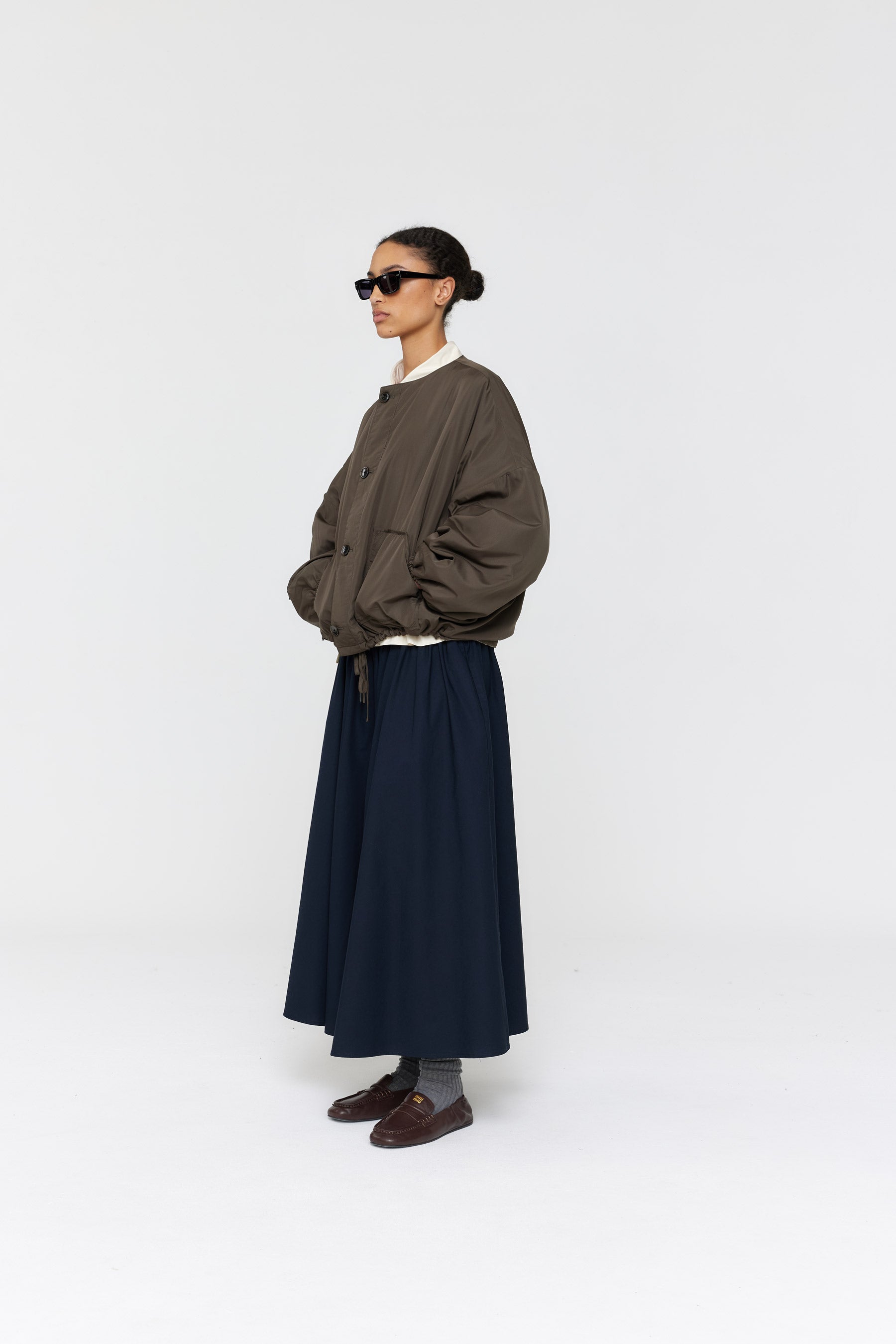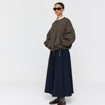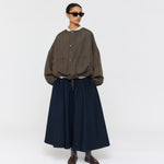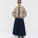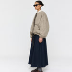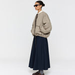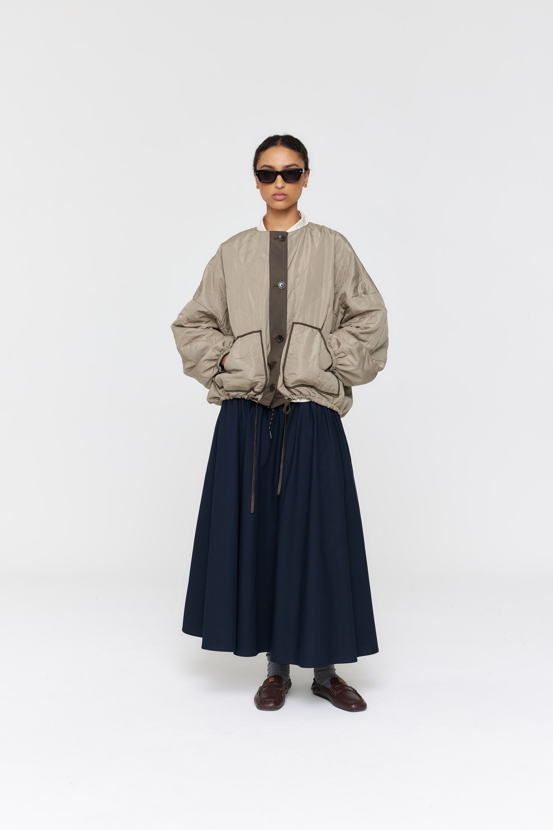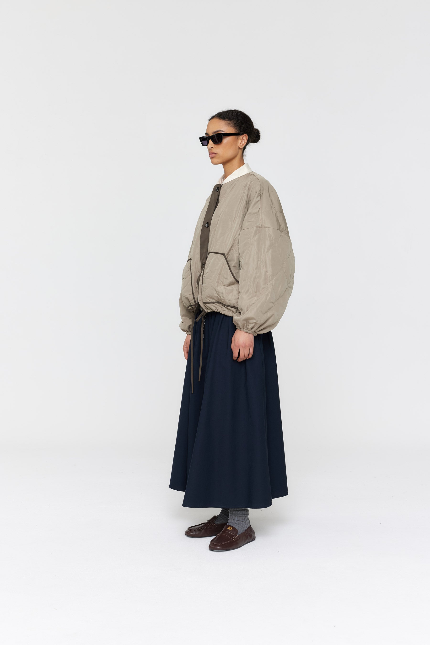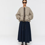 Stay warm and stylish with the Padded Forster Jacket. This quilted jacket is lightweight and features two large contrast patch pockets for convenience. The generous, dropped shoulder fit is complemented by contrast binding edges. Cropped length with fine drawstring ties on the waist. With its reversible design, the jacket is quilted on one side and lightly padded on the other. This jacket is perfect for any occasion.